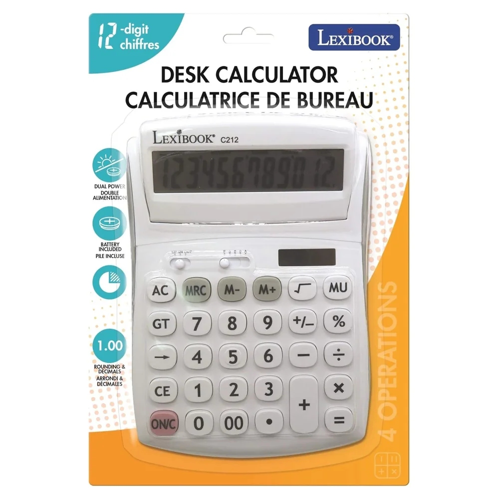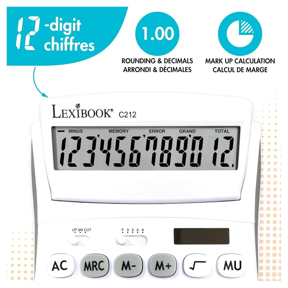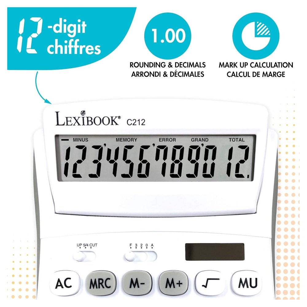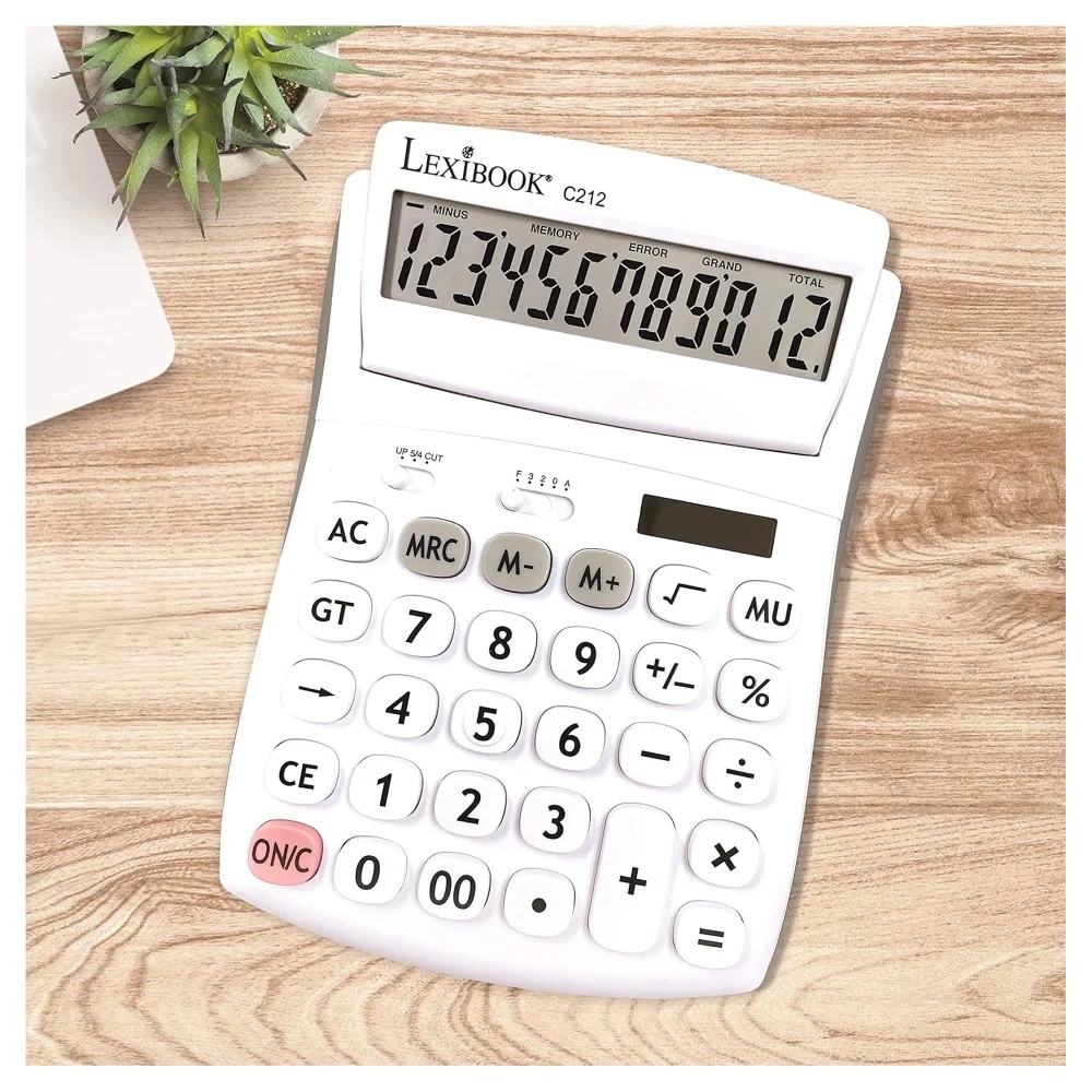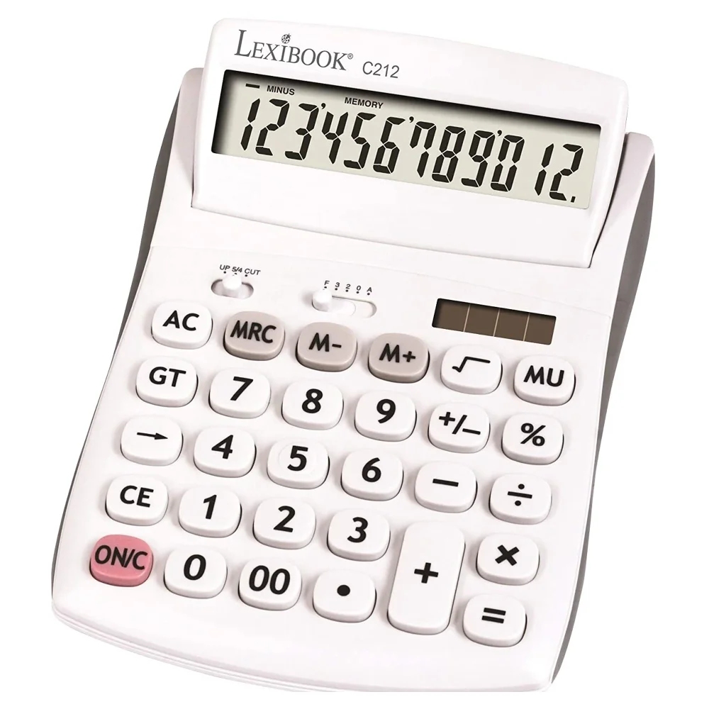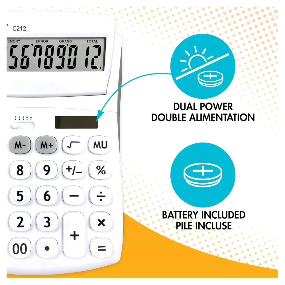 Zaokrouhlování a nastavení desetinné čárky. Opravné tlačítko pro smazání naposledy zadaných číslic. Tlačítko pro výpočet marže. Výklopný 1řádkový display se snadno čitelným 12 čísly. Velké a odolné pogumované klávesy pro maximální pohodlí. Dokonalá velikost, kterou si můžete vzít kamkoli. Perfektní doma, ve škole, v kanceláři a pro podnikání. Ekologické: solární napájení s automatickým vypnutím po několika okamžicích nečinnosti. Duální zdroj energie: solární baterie a baterie AG10 (součástí balení). Rozměry: 19,7 x 14 x 4,5 cm.