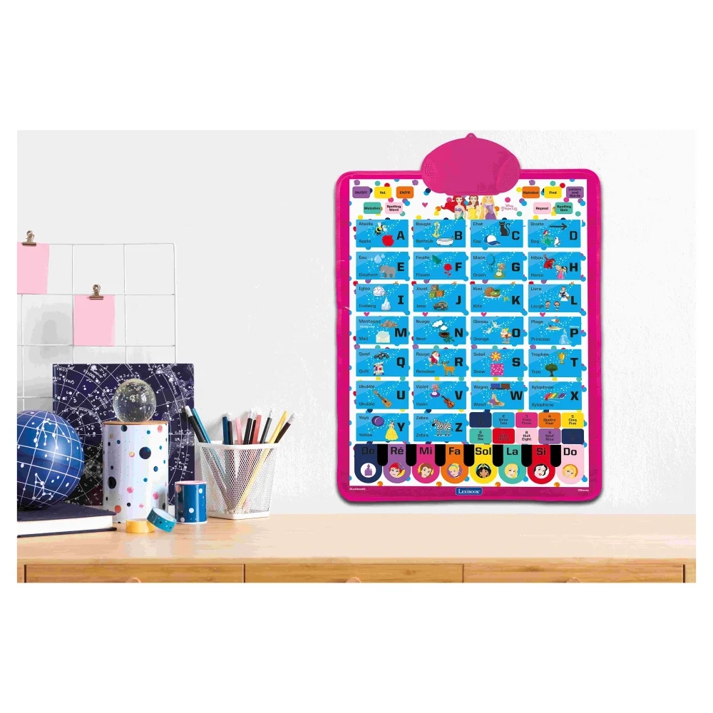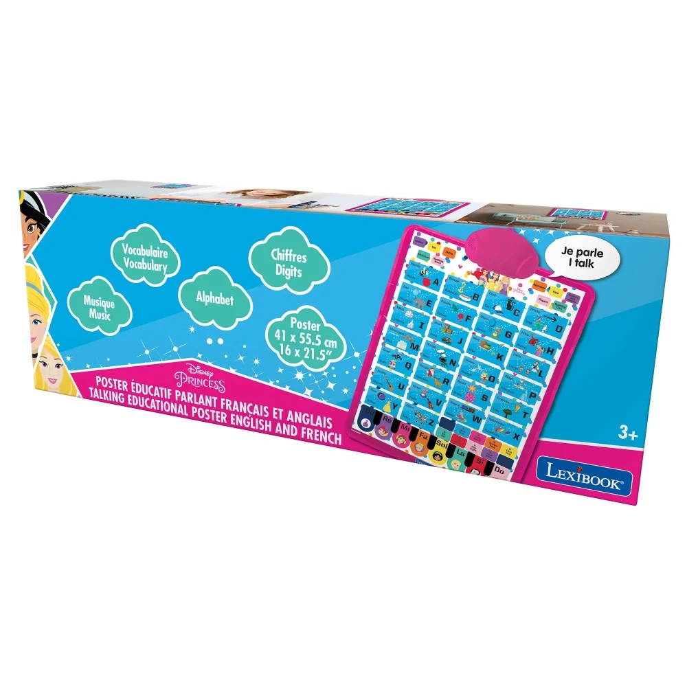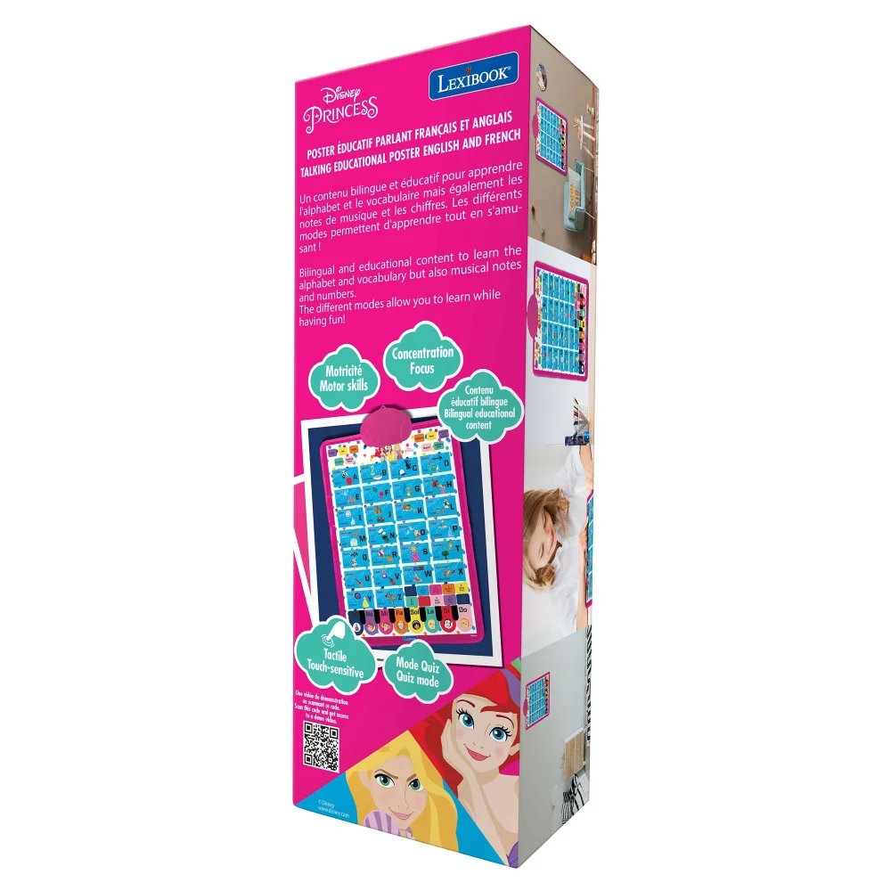 Zábavný anglicko-francouzský plakát, určený k zavěšení na zeď, je výbornou vzdělávací pomůckou pro děti od tří let. Díky několika herním režimům tento dvojjazyčný mluvící plakát děti seznamuje s čísly, abecedou, písmeny, slovní zásobou a hláskováním. Své nabyté znalosti mohou děti otestovat prostřednictvím zábavného interaktivního kvízu, ve kterém odpovídají na otázky a zadané úkoly zmáčknutím příslušného tlačítka. S vestavěným klavírem se děti mohou učit hudební noty nebo si jen tak pro radost zahrát některou z přednastavených melodií.Plakát funguje na tři 1,5 V baterie typu AAA/LR03 (nejsou součástí balení). Je snadno přenosný a s rozměry 16 x 21,5” (41 x 55,5 cm) jej snadno umístíte na zeď dětského pokoje.Interaktivní design podporuje rozvoj motorických dovedností a soustředění u dětí, zatímco vzdělávací obsah poskytuje stimulaci pro rozvoj bilingválních schopností od raného věku.Klíčové vlastnostiAnglicko-francouzský mluvící plakát Disney PrinceznyVzdělávací obsah v interaktivní forměVhodné k zavěšení na zeďStimulace rozvoje jazykových dovedností v raném věkuRůzné režimy pro učení i zábavuSeznamování se s abecedou ("Alphabet"), písmeny a slovní zásobou ("Letters and Words"), hláskováním ("Spelling word") a číslyKvíz "Find": hledání zadaného slova, písmena nebo číslaKvíz "Spelling Quiz": hláskování zadaného slova mačkáním příslušných tlačítekVestavěný klavír pro učení hudebních not nebo k zábavnému hraníTlačítko opakování slova, písmena atd. ("Repeat")MelodieNastavitelná hlasitost ("Vol.")Citlivá tlačítka na dotekRozvoj motorických dovedností a soustředěníMožnost přepínání mezi francouzštinou a angličtinou ("EN/FR")Velikost: 16 x 21,5” (41 x 55,5 cm)Napájení: 3x 1,5 V baterie typu AAA/LR03 (nejsou součástí balení), přihrádku otevřete pomocí šroubováku (není součástí balení)
