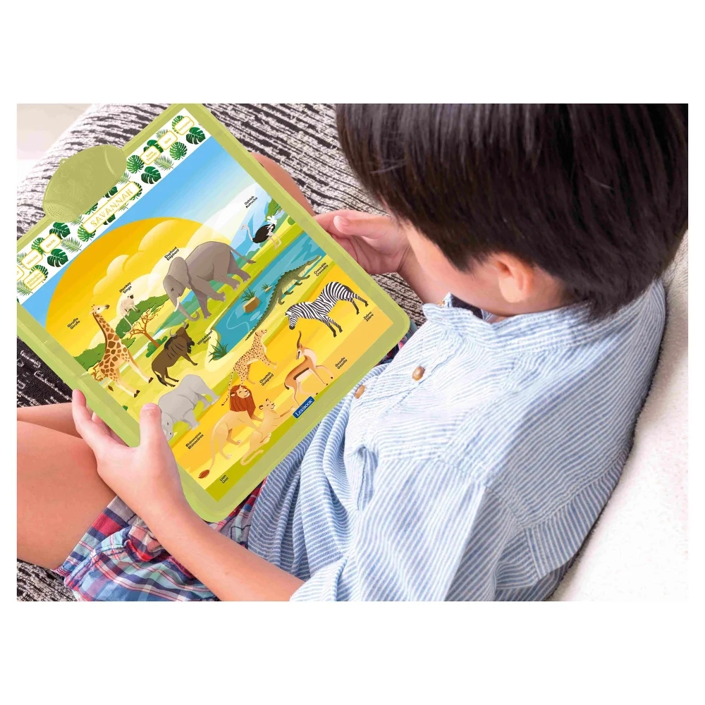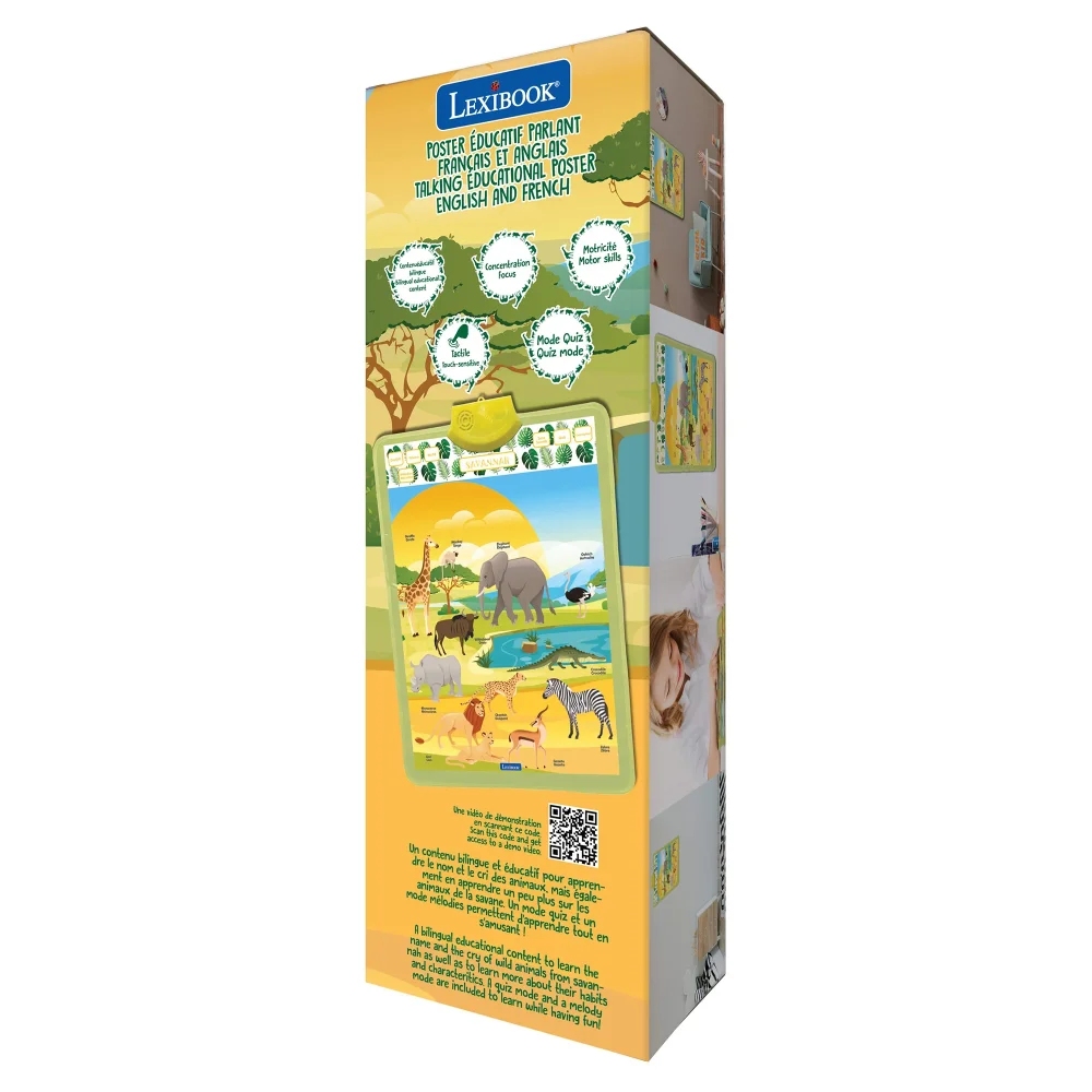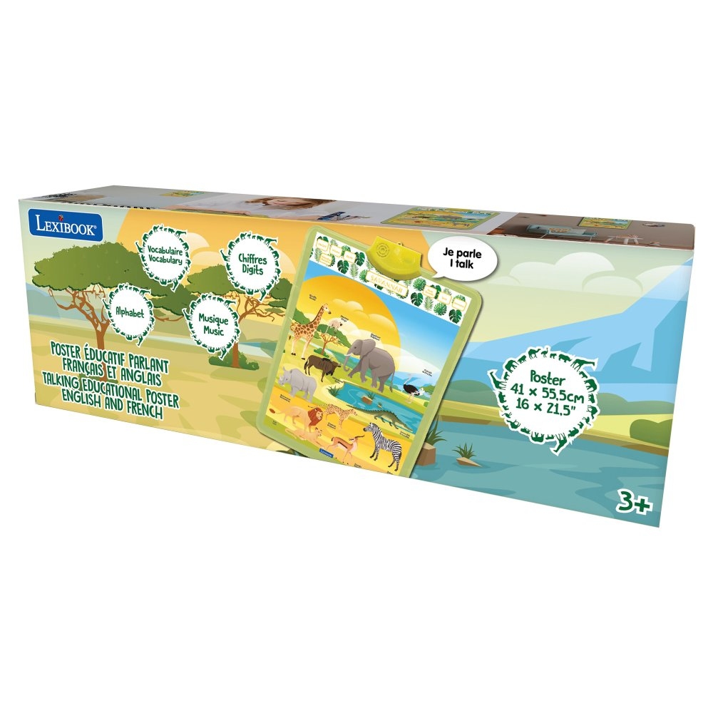 Zábavný anglicko-francouzský plakát, určený k zavěšení na zeď, je výbornou vzdělávací pomůckou pro děti od tří let. Díky několika herním režimům tento dvojjazyčný mluvící plakát děti seznamuje se zvířaty žijícími v savaně, jejich jmény a zvuky, které vydávají. V příslušném jazyce se děti dozvědí také o jejich vlastnostech a návycích. Stačí jen stisknout obrázky jednotlivých zvířat. Své nabyté znalosti mohou děti otestovat prostřednictvím zábavného interaktivního kvízu, ve kterém odpovídají na otázky a zadané úkoly zmáčknutím tlačítka s odpovídajícím zvířetem. K dispozici jsou také zábavné melodie.Plakát funguje na tři 1,5 V baterie typu AAA/LR03 (nejsou součástí balení). Je snadno přenosný a s rozměry 16 x 21,5” (41 x 55,5 cm) jej snadno umístíte na zeď dětského pokoje.Interaktivní design podporuje rozvoj motorických dovedností a soustředění u dětí, zatímco vzdělávací obsah poskytuje stimulaci pro rozvoj bilingválních schopností od raného věku.Klíčové vlastnostiAnglicko-francouzský mluvící plakát SavanaVzdělávací obsah v interaktivní forměVhodné k zavěšení na zeďStimulace rozvoje jazykových dovedností v raném věkuRůzné režimy pro učení i zábavuObjevování zvířat savany stiskem příslušných tlačítekMožnost přepínání mezi francouzštinou a angličtinou ("EN/FR")"Sons/Sounds" režim děti seznamuje se zvuky zvířatInteraktivní kvíz "Quiz": plakát položí otázku, na kterou dítě odpoví stisknutím odpovídajícího zvířete"Description" režim představuje vlastnosti a zvyky zvířatMelodieNastavitelná hlasitost ("Volume")Citlivá tlačítka na dotekRozvoj motorických dovedností a soustředěníVelikost: 16 x 21,5” (41 x 55,5 cm)Napájení: 3x 1,5 V baterie typu AAA/LR03 (nejsou součástí balení), přihrádku otevřete pomocí šroubováku (není součástí balení)