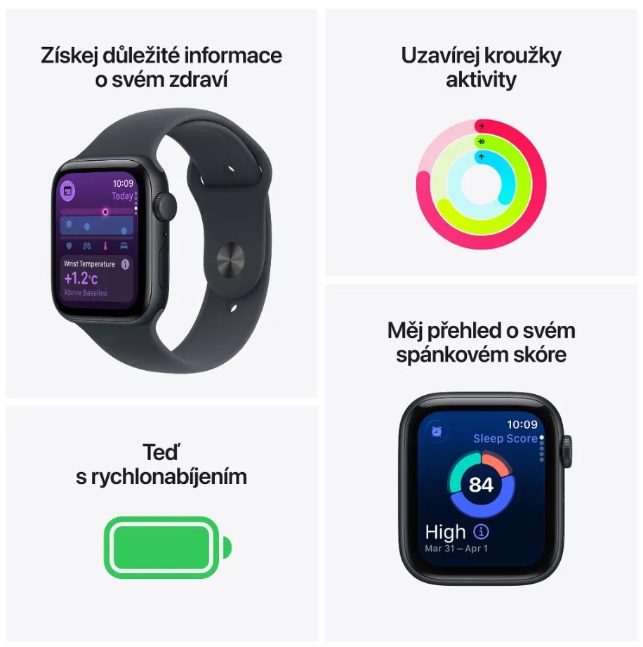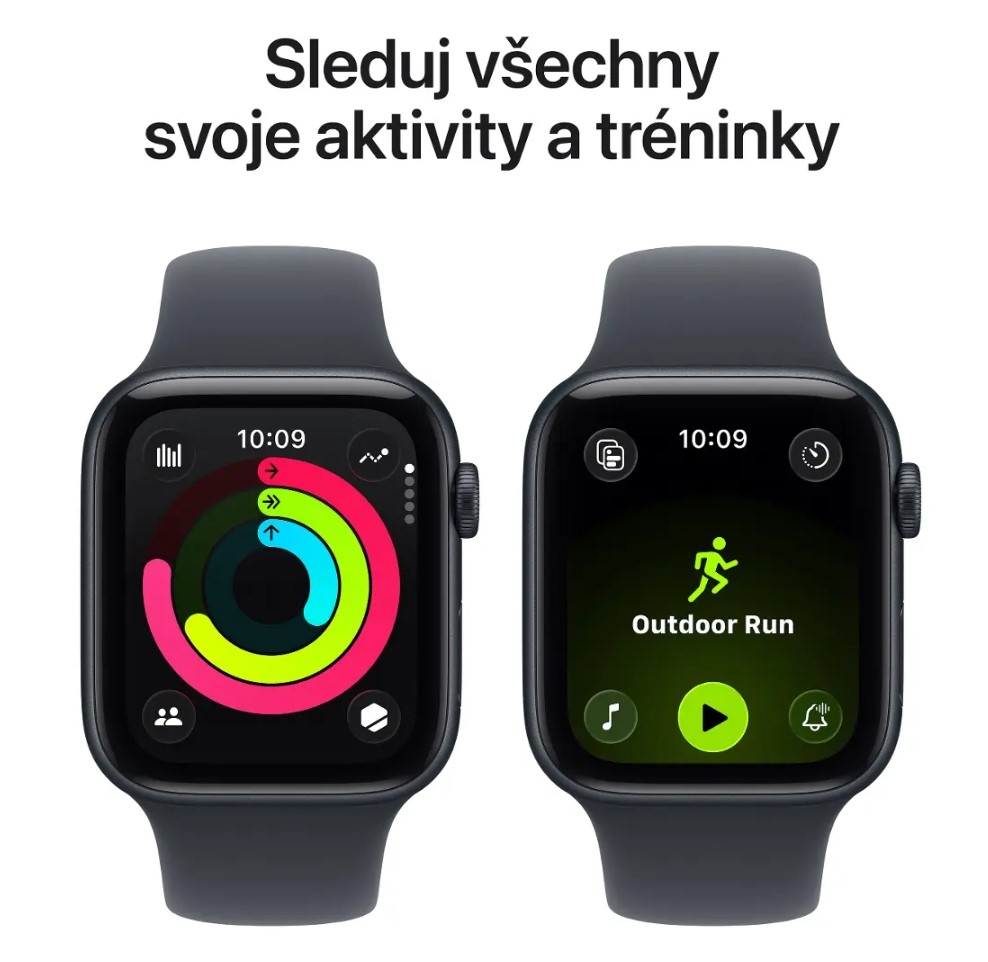 Stylové chytré hodinky pro každý den. Apple Watch SE v 44mm provedení kombinují moderní design, intuitivní ovládání a praktické funkce, které usnadňují každodenní život. Hliníkové pouzdro v barvě Midnight doplňuje sportovní řemínek pro pohodlné nošení.