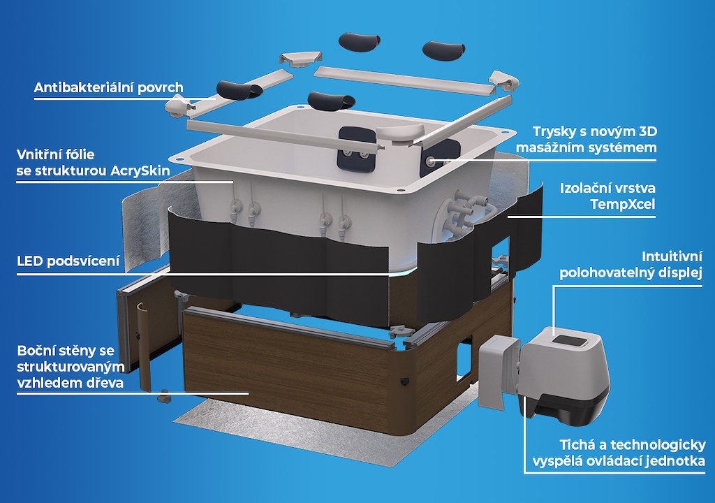 = Trysky: 140 vzduchových + 8 nastavitelných hydromasážních trysek