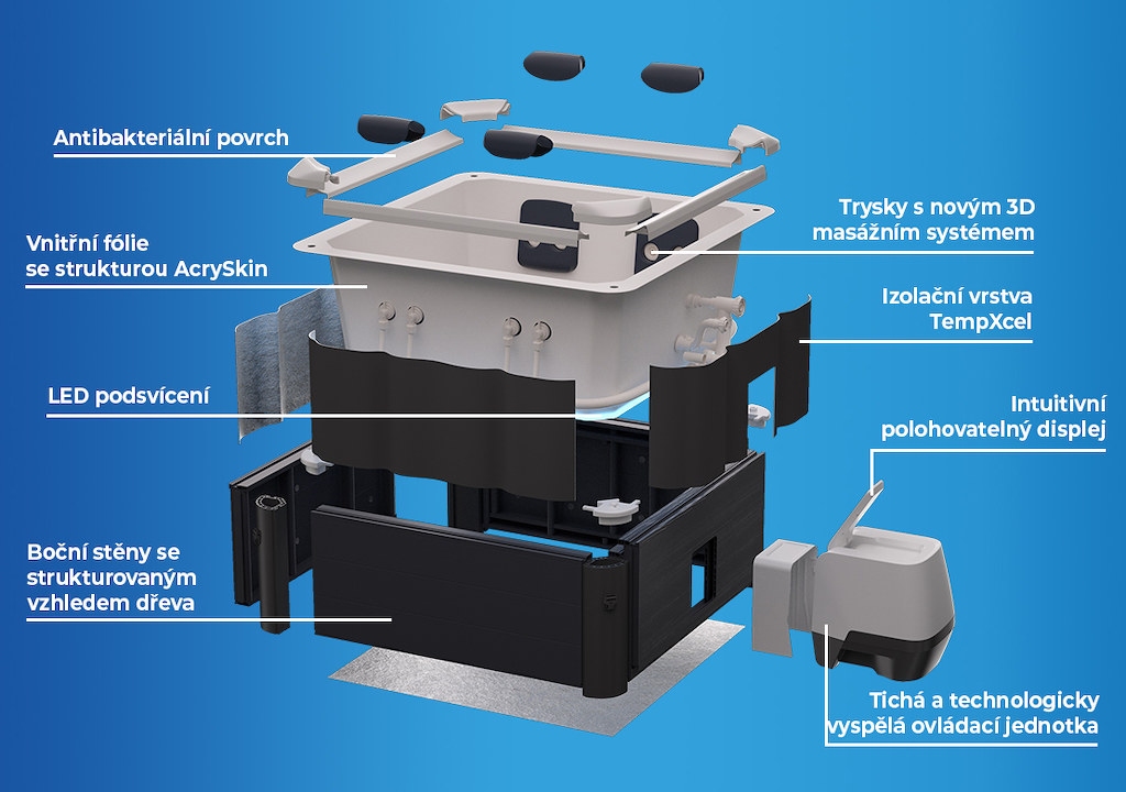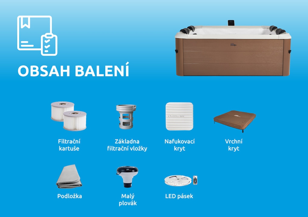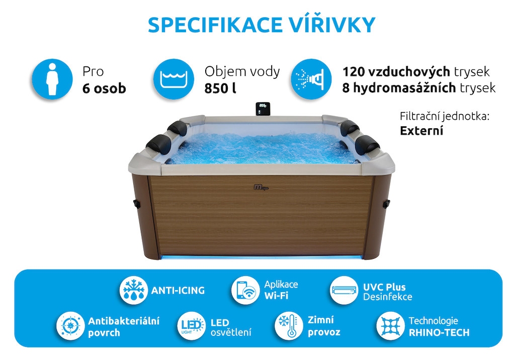 Je vybavena 120 vzduchovými a 8 nastavitelnými hydromasážními tryskami a samozřejmě i účinným ohřevem vody. Obsahuje také vrchní kryt, který pomůže udržet teplotu vody stále vysoko. Bezpečnostní klipsny zajistí, že zůstane bezpečně uzavřená.