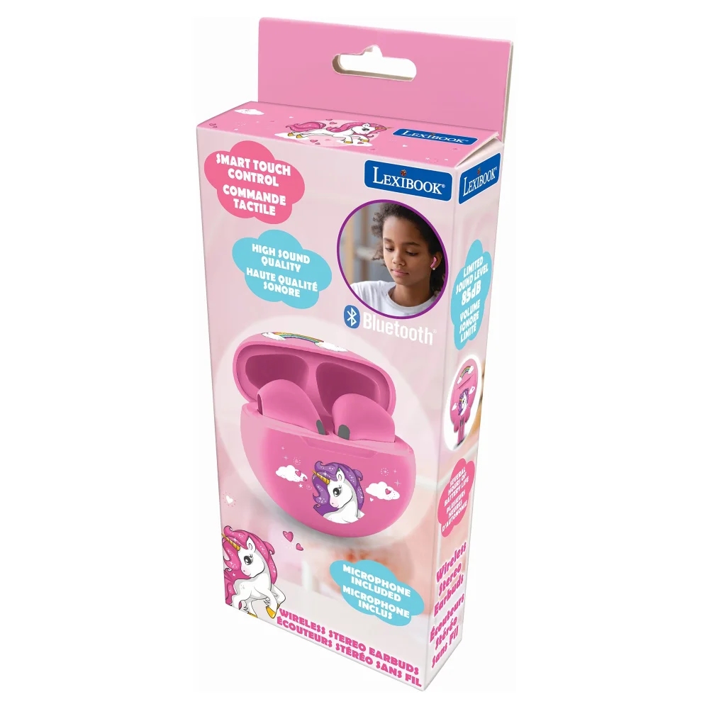Zamilovaly se vaše děti do Jednorožců? Není divu! Tato fascinující a tajemná stvoření s okouzlující duhově zbarvenou hřívou, třpytkami a kouzelnými rohy probouzejí v našich nejmenších pocity radosti a štěstí, a stávají se tak symbolem dětské fantazie. Ať už je vídáme v pohádkách, filmech nebo knížkách, jejich půvab nás pokaždé ohromí. Nechte tato éterická zvířátka doprovázet vaše malé snílky na jejich cestě do světa plného představivosti a zvědavosti, který zůstane navždy v jejich srdcích!Naše dětská stereo sluchátka představují dokonalou kombinaci stylu, praktičnosti a bezpečnosti. S omezenou hlasitostí na 85 dB zajišťují ochranu dětských ušních bubínků, takže nemusíte mít obavy, že vystavíte děti škodlivě vysokým hladinám hluku. Tato lehká bezdrátová sluchátka jsou kompatibilní se všemi chytrými telefony, tablety a dalšími přehrávači s technologií Bluetooth. Dotykové ovládání a mikrofon na každém sluchátku umožňují přijímat hovory a snadno ovládat hudbu (přehrávání/pauza/další/předchozí). Kompaktní pouzdro, které se snadno vejde do kapsy, slouží nejen k uschování sluchátek, ale především k jejich nabíjení. Sluchátka vydrží 3 až 4 hodiny nepřetržitého poslechu a nabízí vysokou kvalitu zvuku.Nabíjecí pouzdro s vestavěnou dobíjecí baterií nabijete pomocí USB kabelu typu C (součástí balení). Druhý konec kabelu zapojte do USB portu počítače nebo USB adaptéru (není součástí balení). Doba nabíjení je cca 1,5 hodiny.Sluchátka dětem umožňují těšit se z hudby, videoher a audioknih a mohou být užitečným nástrojem k zábavě na cestách nebo ve veřejných dopravních prostředcích. Vzhledem k tomu, že sluchátka pro dospělé nemusí být vždy vhodná pro citlivé dětské uši kvůli neregulované hlasitosti, jsou dětská sluchátka nejlepší volbou.Klíčové vlastnostiTéma JednorožecBezdrátová stereo sluchátka do ušíHlasitost je kvůli ochraně dětských uší omezena na 85 dBPraktická k poslechu hudby a audioknih během cestováníSluchátka jsou velmi lehká a s nabíjecím pouzdrem se snadno vejdou do každé kapsyDotykové ovládání: snadné ovládání hudby (přehrávání/pauza/další/předchozí)Možnost přijímat hovory díky mikrofonu na každém sluchátkuPouzdro slouží nejen k uschování, ale především k nabíjení sluchátekKompatibilní se všemi chytrými telefony, tablety a dalšími přehrávači s technologií Bluetooth® 5.1Vysoká kvalita zvukuDlouhá výdrž přehrávání: 3 až 4 hodiny nepřetržitého poslechuDoba nabíjení: cca 1,5 hodinyNapájení: pouzdro s dobíjecí baterií nabijete pomocí USB kabelu typu C (součástí balení), druhý konec kabelu zapojte do USB portu počítače nebo USB adaptéru (není součástí balení)