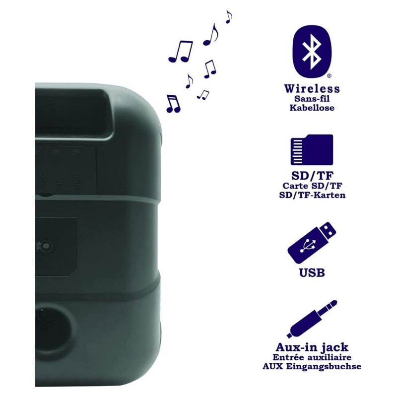 Výkonný zvukový systém! Pracuje bezdrátově se zařízeními vybavenými technologií Bluetooth 5.0. Reproduktor se může přeměnit v karaoke díky mikrofonu, který je součástí balení. Systém True Wireless Stereo (TWS): synchronizujte 2 reproduktory stejného modelu dohromady a užívejte si stereofonní zvuk! Port USB a slot pro kartu micro-SD/TF. Připojte paměťové karty USB nebo elektronická zařízení díky různým portům (kabel je součástí balení). Vícebarevné světelné efekty na reproduktoru! Vestavěná dobíjecí baterie (1200 mAh): Až několik hodin světla a zvuku na cestách. Rozměry výrobku : 25 x 19 x 34,5 cm. Součástí balení je příslušenství: Aux in kabel + nabíjecí kabel USB typu C + návod k použití + mikrofon.