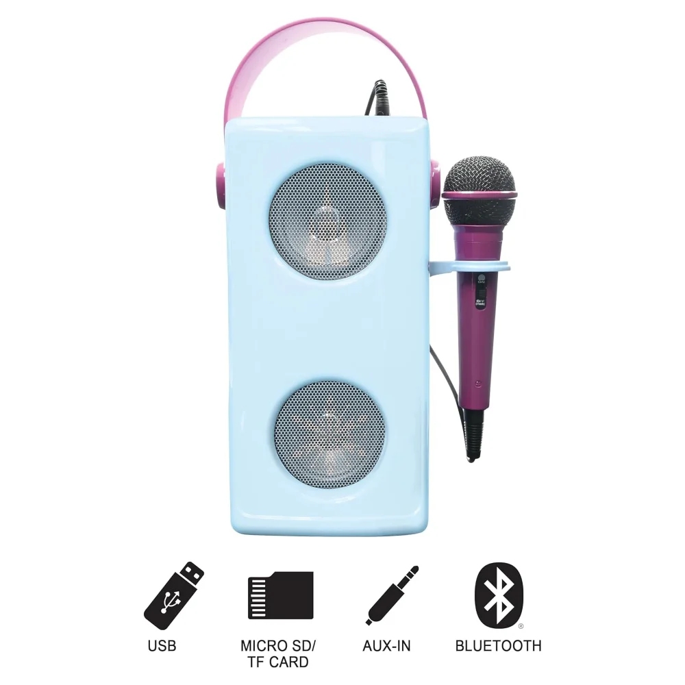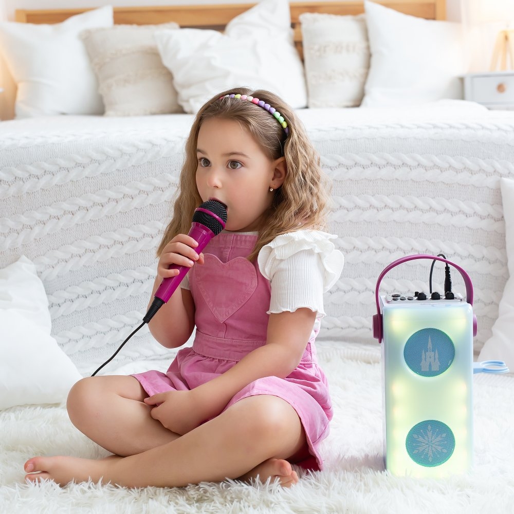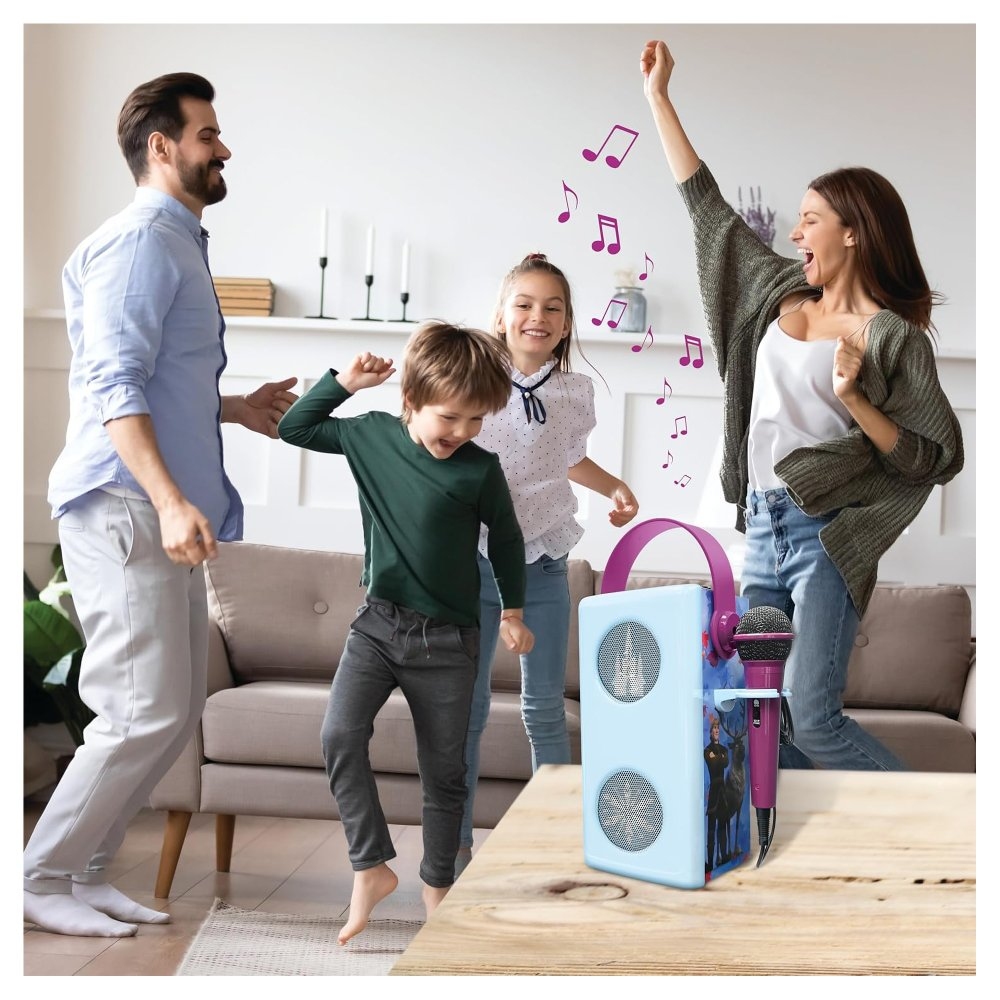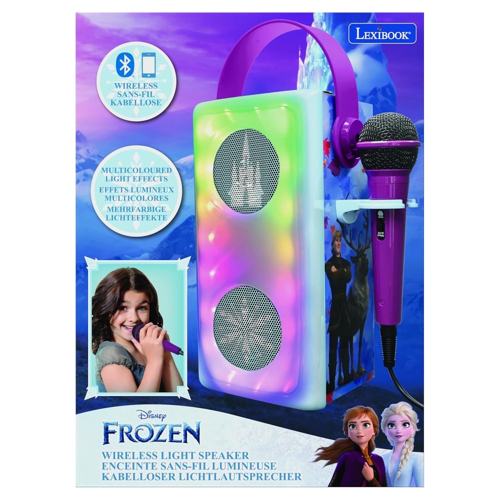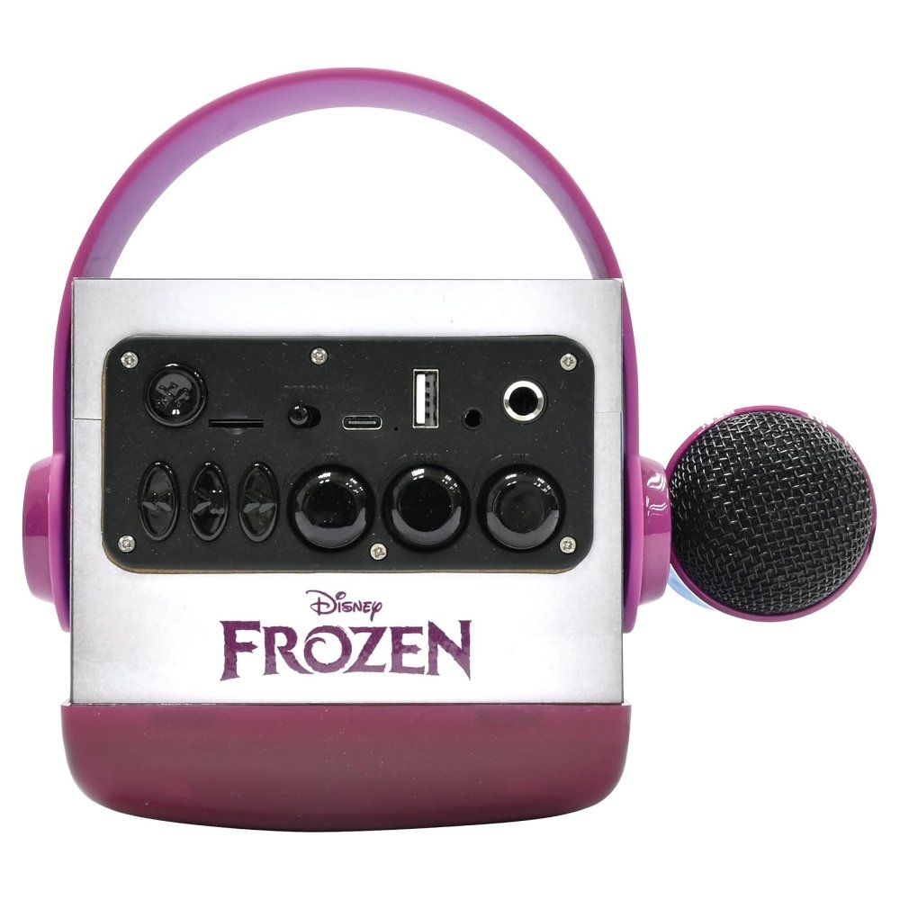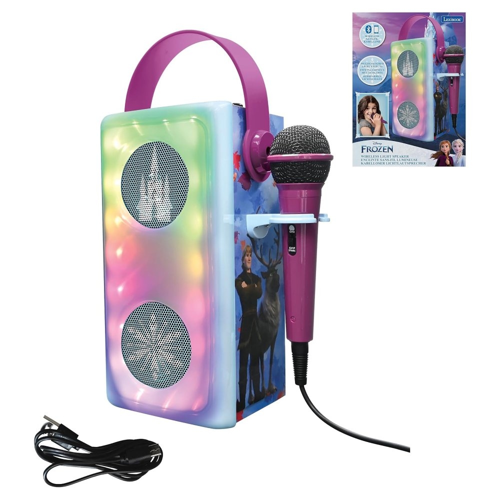Skvělý způsob, jak dětem dopřát karaoke zábavu s vlastním hudebním výběrem! Tento reproduktor pro děti lze spárovat pomocí Bluetooth® 5.0, má USB port pro připojení USB disku (disk není součástí balení) a slot pro SD/TF karty až do 32 GB (karta není součástí balení), což nabízí široké možnosti připojení hudby. Audio zařízení lze také připojit pomocí vstupního konektoru AUX-in a kabelu (součástí balení). Mikrofon s nastavitelným efektem ozvěny a ovládáním hlasitosti je součástí balení. Barevné LED diody skvěle podpoří atmosféru a praktická rukojeť usnadní přenášení.Vestavěnou dobíjecí baterii snadno nabijete pomocí micro USB kabelu typu C (součástí balení) nebo USB adaptéru (není součástí balení).Zpívání pozitivně podporuje sebevyjádření dětí, což jim pomáhá rozvíjet jejich emocionální a komunikační dovednosti. Navíc je to skvělý způsob, jak do hry přidat hudební prvek.Klíčové vlastnosti2 reproduktory s drátovým mikrofonem Ledové královstvíSkvělý doplněk pro dětskou karaoke zábavuPusťte dětem jejich oblíbenou hudbuBezdrátová funkce Bluetooth® 5.0 pro připojení telefonů, tabletů a dalších audio zařízení (zařízení nejsou součástí)Slot na paměťové micro karty SD/TF až do 32 GB (karty nejsou součástí)USB port pro flash disk (disk není součástí)3,5mm vstupní konektor AUX-in a AUX-in kabel (součástí balení) pro přehrávání MP3 souborů z externích audio zařízení (zařízení nejsou součástí)Barevné světelné efektyEfekt ozvěny hlasu na mikrofonuNastavení hlasitosti mikrofonuPraktická rukojeť a držák na mikrofonNapájení: Vestavěná dobíjecí lithiová baterie 1200mAh (součástí balení), nabíjení pomocí micro USB kabelu typu C (součástí balení) nebo USB adaptéru (není součástí balení)