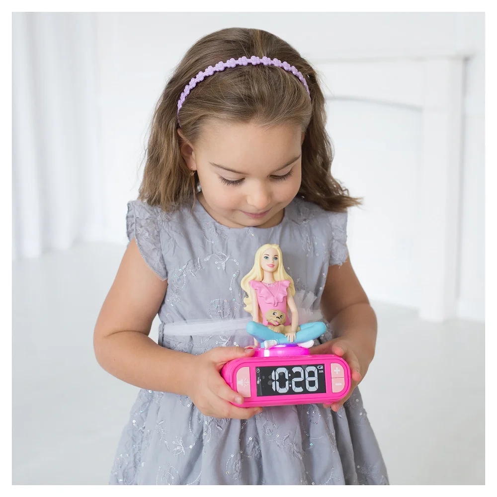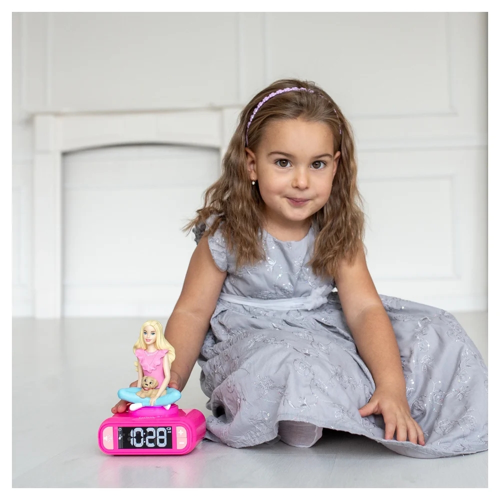 Barbie již více než 60 let baví a inspiruje celé generace! Chtějí se vaši malí fanoušci také stát součástí tohoto růžového, luxusního světa? S jejími módními oblečky, krásnými doplňky a luxusním životním stylem není překvapením, proč jsou děti touto okouzlující postavičkou a jejími přáteli fascinovány. Nechte své děti snít ve velkém a pomozte jim vyjádřit jejich kreativitu, představivost a sebevědomí po boku nejikoničtějšího vzoru moderní doby!Tento roztomilý budík má všechno potřebné pro zajištění klidné noci a senzačního rána! S uživatelsky přívětivými ovládacími tlačítky můžete hodiny lehce nastavit v režimu 12/24 hodin a stejně tak i čas budíku; to vše dobře viditelné na podsvícené LCD obrazovce nenarušující spánek. Na výběr máte ze šesti různých tematických tónů budíku a extra tlačítka se šesti tematickými zvukovými efekty pro ještě větší zábavu! Můžete nastavit hlasitost, aby postupně rostla nebo rovnou zvolit vyšší úroveň. A co je na něm to nejlepší? Rozhodně zářící 3D noční světlo, které se rozsvítí při stisknutí horní části zařízení nebo když zazvoní budík! Navíc se světlo automaticky zhasne po dvou minutách nebo když horní část znovu stisknete. Chcete-li vypnout budík, stačí jen stisknout jeho horní část. A pro ty, kteří se chtějí dál válet v posteli, je tu funkce odložení, která přinese dalších devět minut spánku!Budík je napájen třemi 1,5V bateriemi typu AA/LR6 (nejsou součástí balení). Na obrazovce se zobrazí ukazatel vybité baterie, když je nutná jejich výměna, a ikony pro odložení a nastavení budíku.Přidání budíku do dětského pokoje může dítě pomoct naučit, jak číst hodiny, kdy má ráno vstát z postele, v kolik musí být ve škole a jak má úměrně svému věku hospodařit s časem!Klíčové vlastnostiTéma BarbieSkvělý nástroj, jak se naučit číst hodinyMůže pomoct naučit hospodaření s časem odpovídající věku dítěteBudík s 3D nočním světlem6 různých tématických tónů budíku a tlačítko pro zvukové efektyPodsvícená LCD obrazovka nenarušující spánekNastavitelná hlasitostJednoduchým stisknutím horní části nebo zazvoněním budíku se zařízení rozsvítí (světlo se automaticky vypne po 2 minutách nebo stisknutím)Chcete-li zastavit budík – prostě stiskněte horní nebo spodní část zařízeníFunkce odložení (odloženo o 9 minut)Budík se automaticky zastaví po 5 minutách, pokud není stisknuto žádné tlačítko (1 minuta, pokud je aktivována funkce odložení)Snadné nastavení času a budíku; uživatelsky přívětivá tlačítka a ikony viditelné na obrazovceNapájení 3x 1,5V baterie typu AA/LR6 (nejsou součástí balení)