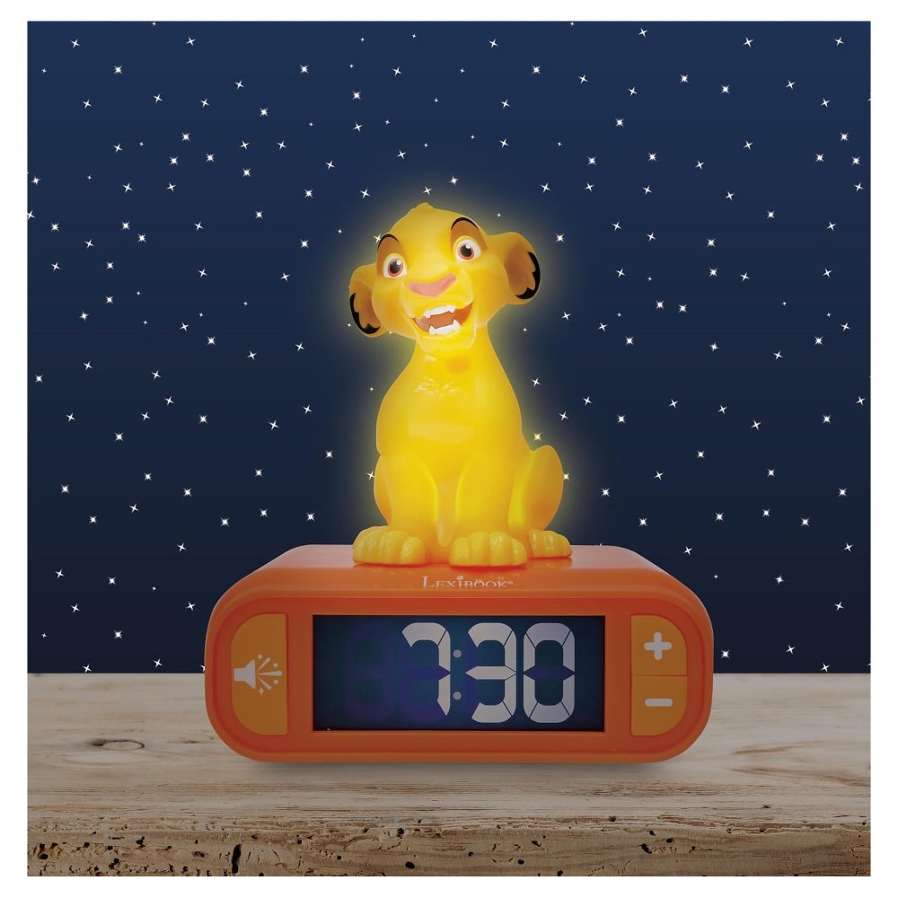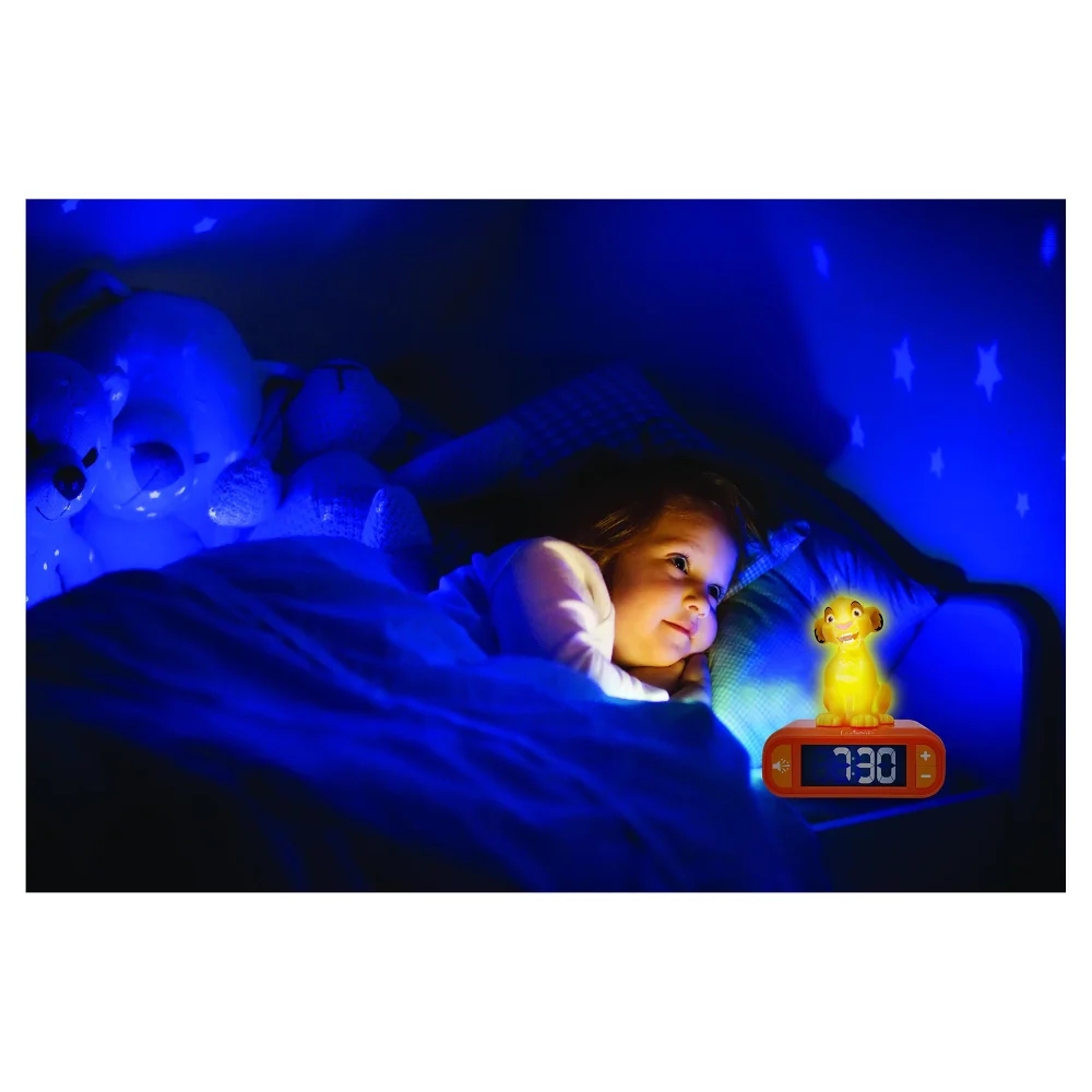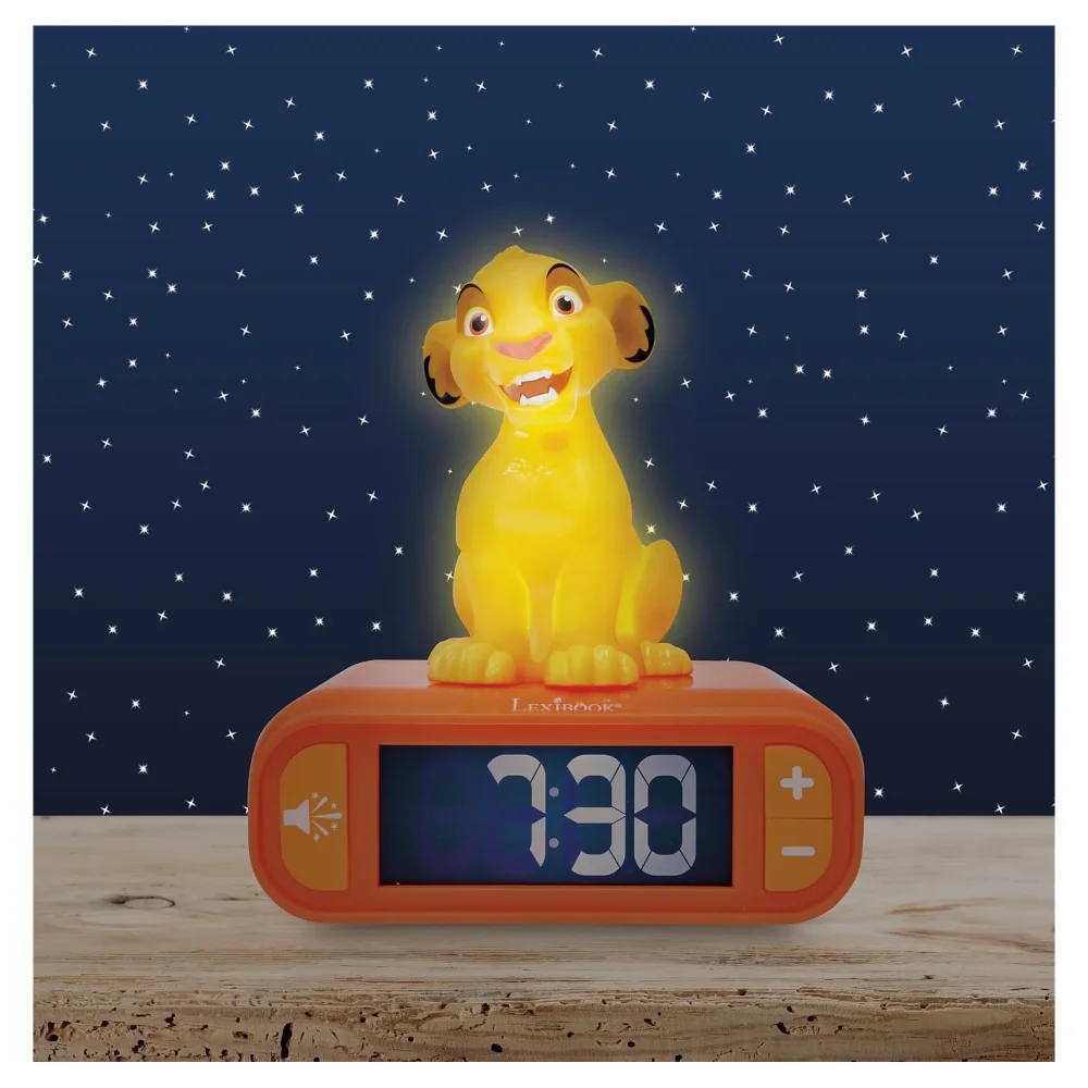 Tento roztomilý budík nabízí vše potřebné pro klidný spánek a příjemné probuzení! S intuitivními ovládacími tlačítky lze lehce nastavit čas na podsvícené LCD obrazovce, která nenarušuje spánek. Vyberte si z několika tematických tónů budíku a užijte si zábavné zvukové efekty. Hlasitost na zařízení je nastavitelná. Zářící 3D noční světlo se rozsvítí při stisknutí horní části zařízení nebo když zazvoní budík! Světlo automaticky zhasne po pár minutách nebo když horní část znovu stisknete. A pro ty, kteří se chtějí dál válet v posteli, je tu funkce odložení.Budík je napájen třemi 1,5V bateriemi typu AA/LR6 (nejsou součástí balení). Na obrazovce se zobrazí ukazatel vybité baterie a ikony pro odložení a nastavení budíku.Umístění budíku do dětského pokoje může dítěti pomoci naučit se číst hodiny, vědět, kdy vstávat, kdy má být ve škole a jak efektivně hospodařit s časem podle svého věku!Klíčové vlastnosti 3D Budík Simba Skvělý nástroj, jak se naučit číst hodiny Budík s 3D nočním světlem Tematické tóny budíku a tlačítko pro zvukové efekty Podsvícená LCD obrazovka nenarušující spánek (lze kompletně vypnout) Nastavitelná hlasitost Jednoduchým stisknutím horní části nebo zazvoněním budíku se zařízení rozsvítí (světlo se automaticky vypne po pár minutách nebo stisknutím) Chcete-li zastavit budík – jednoduše stiskněte horní nebo spodní část zařízení Funkce odložení Snadné nastavení času a budíku; uživatelsky přívětivá tlačítka a ikony viditelné na obrazovce Napájení 3x 1,5V baterie typu AA/LR6 (nejsou součástí balení)