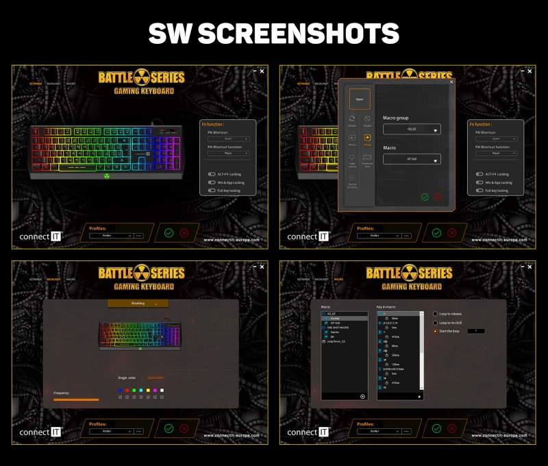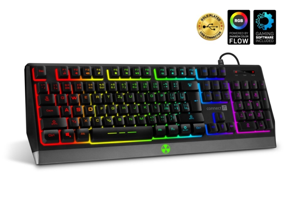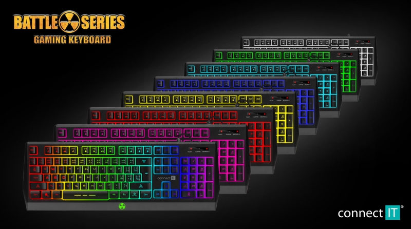 Profesionální herní klávesnice Connect IT Battle RGB (CKB-5600-CS) s CZ/SK rozložením, 11 RGB režimy, anti-ghost funkcí, multimediálními klávesami a pokročilým softwarem pro tvorbu maker i úpravu podsvícení. Prémiový oplet kabelu, pozlacený USB a skvělá kompatibilita.