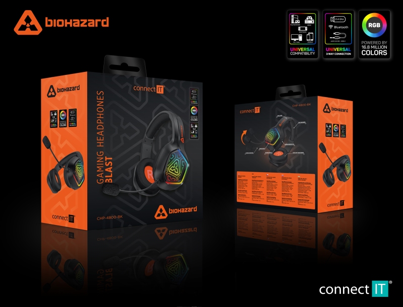 Profesionální bezdrátová sluchátka Connect IT Biohazard Blast CHP-4800-BK s RGB podsvícením, výdrží až 30 hodin a pohodlnými náušníky. Nabízejí spolehlivý přenos přes 2.4 GHz i Bluetooth, odnímatelný mikrofon a možnost kabelového připojení. Ideální pro hráče, kteří chtějí volnost bez kompromisů.