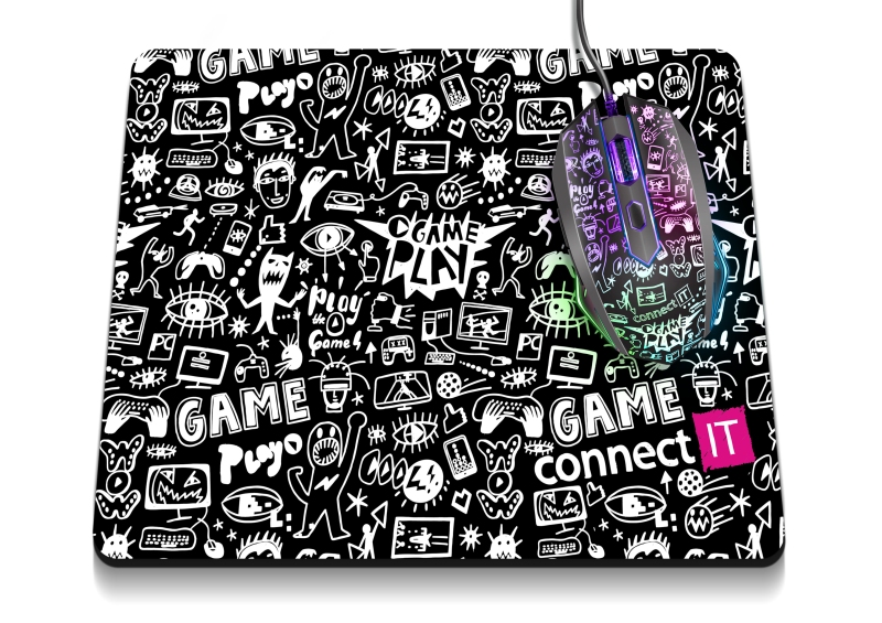 Stylová herní podložka Connect IT DOODLE CMP-1120-SM velikosti S s měkkým povrchem, pogumovanou protiskluzovou základnou a vodoodpudivou úpravou. Tkanina podporuje přesný pohyb všech typů myší, ideální pro hráče i grafiky.