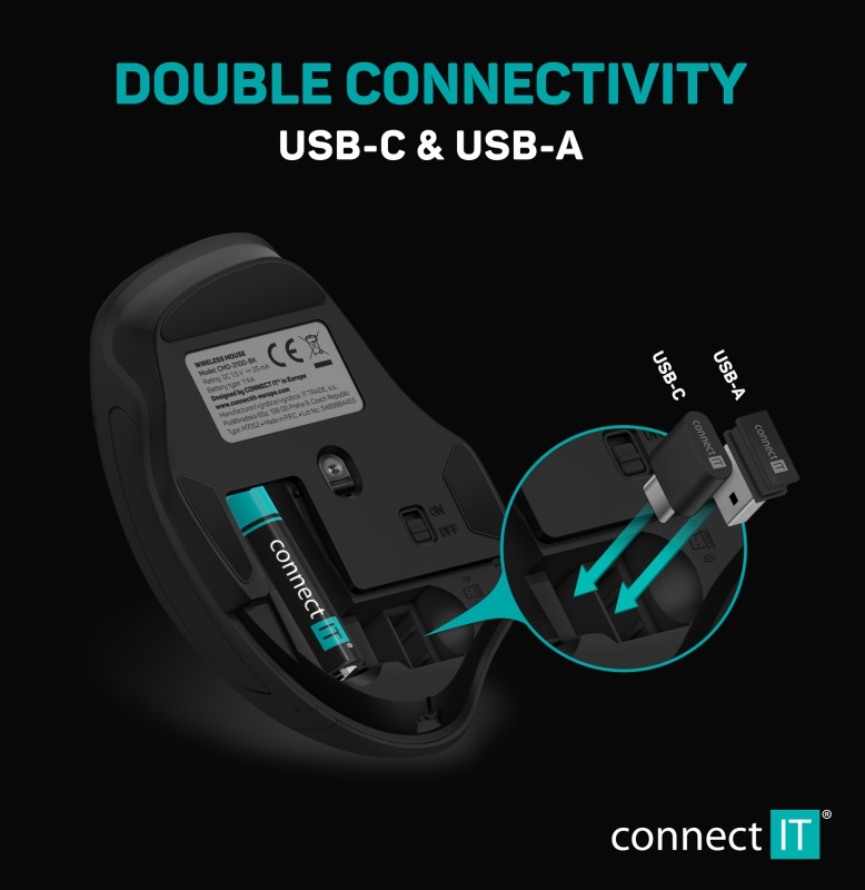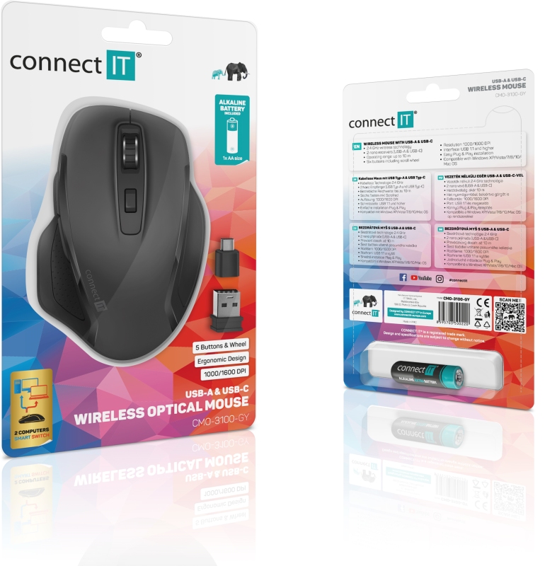 Connect IT Dual SmartSwitch bezdrátová myš, USB-A + C (+1x AA baterie) - šedá