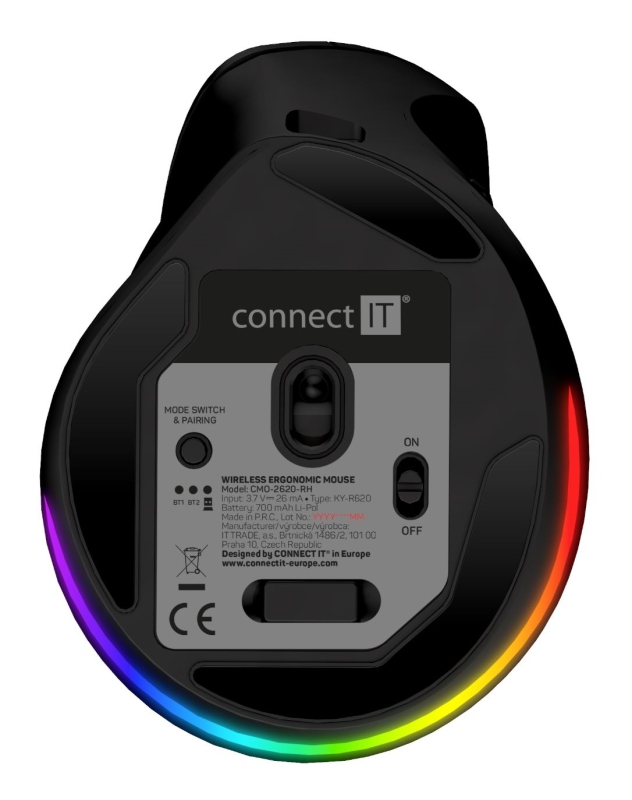Vertikální ergonomická myš CMO-2620-RH s tichým chodem a RGB podsvícením. Funkce TriMode umožňuje připojení až ke třem zařízením. Skvělá volba pro prevenci karpálního tunelu i práci v klidném prostředí.