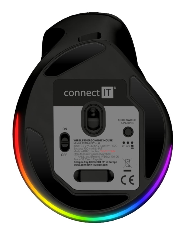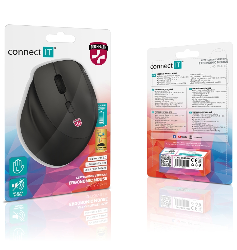 Connect IT For Health Cloudy LEFT (CMO-2620-LH) je bezdrátová vertikální ergonomická myš určená speciálně pro leváky jako prevence syndromu karpálního tunelu. Díky přirozené poloze ruky výrazně snižuje únavu při dlouhodobé práci. Nabízí tiché spínače, RGB podsvícení a technologii TriMode pro připojení až ke třem zařízením současně. Ideální volba pro domácí i profesionální kancelářské použití.
