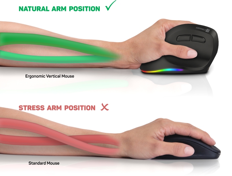Connect IT For Health Cloudy LEFT je vertikální ergonomická bezdrátová myš určená výhradně pro leváky, navržená s jasným cílem – dlouhodobě chránit zdraví zápěstí a předloktí při každodenní práci s počítačem. Oproti klasickým myším udržuje ruku v přirozené poloze, čímž omezuje nepřirozené křížení šlach a kostí a výrazně snižuje tlak na střední nerv v oblasti zápěstí.