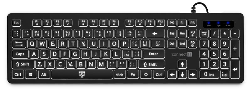 Ergonomická klávesnice CKB-7100-CS s velkým bílým podsvíceným fontem pro snadnou čitelnost. Ideální volba pro seniory, děti nebo osoby se zrakovým omezením. Tichý chod, multimediální funkce a vysoká odolnost z ní dělají skvělého pomocníka pro každý stůl.