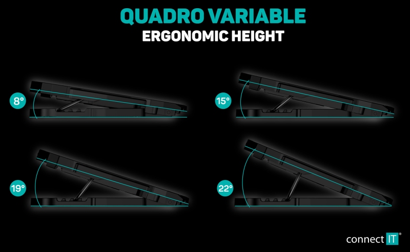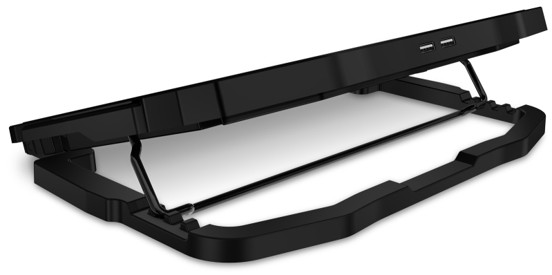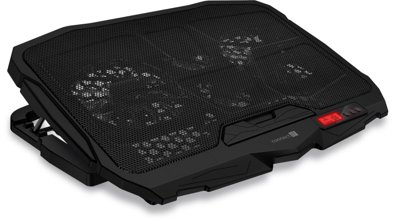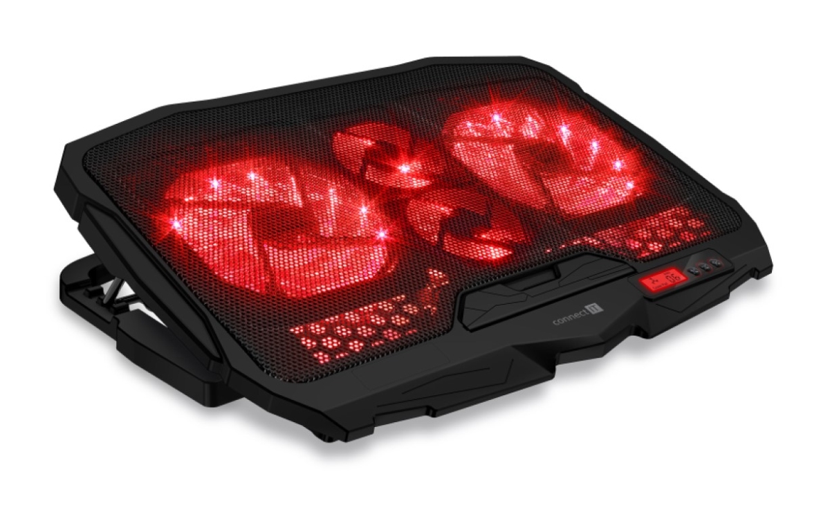 Výkonná podložka CCP-2200-RD pod notebook se 4 tichými ventilátory, červeným LED podsvícením, LCD displejem, nastavitelným sklonem ve 4 úrovních, regulací otáček ve 6 stupních, dvěma USB porty a robustní kovovou mřížkou pro efektivní chlazení až do 15,6".