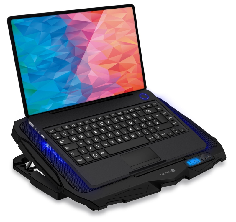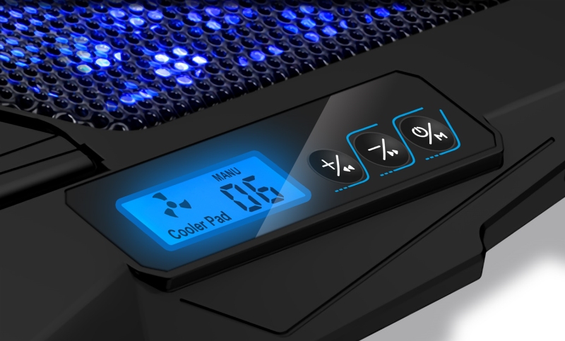 Výkonná chladicí podložka CCP-2200-BK pod notebook s tichým chodem, 4 ventilátory s nastavitelnou rychlostí, LCD displejem, modrým podsvícením, výškovým polohováním a dvěma USB porty. Ideální pro práci i hraní – doma i na cestách.