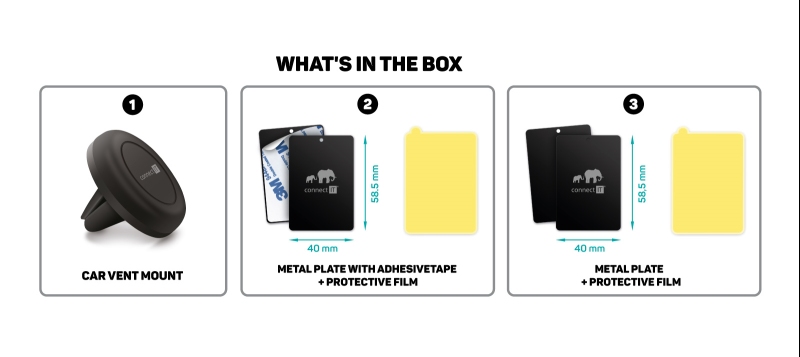 Kompaktní magnetický držák Connect IT InCarz 4StrongFix CMC-3044-BK s 4 silnými magnety bezpečně udrží váš mobil i při rychlé jízdě. Nabízí neviditelné uchycení, antivibrační povrch, kompatibilitu s většinou telefonů, pouzder i mřížek a snadné ovládání jednou rukou.