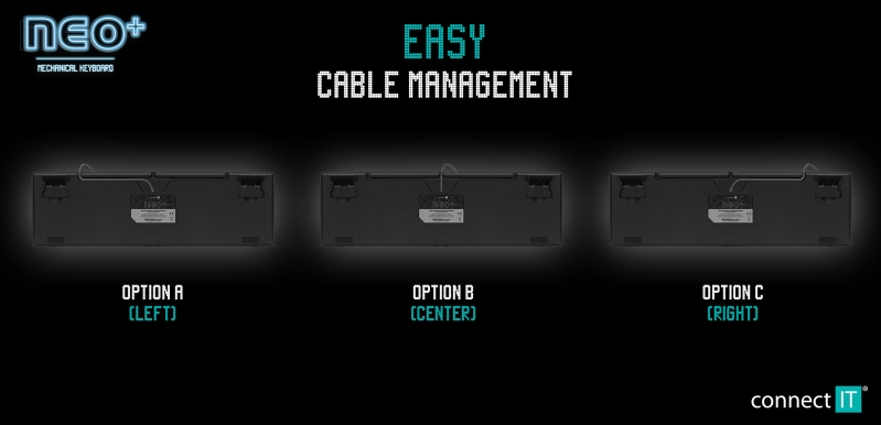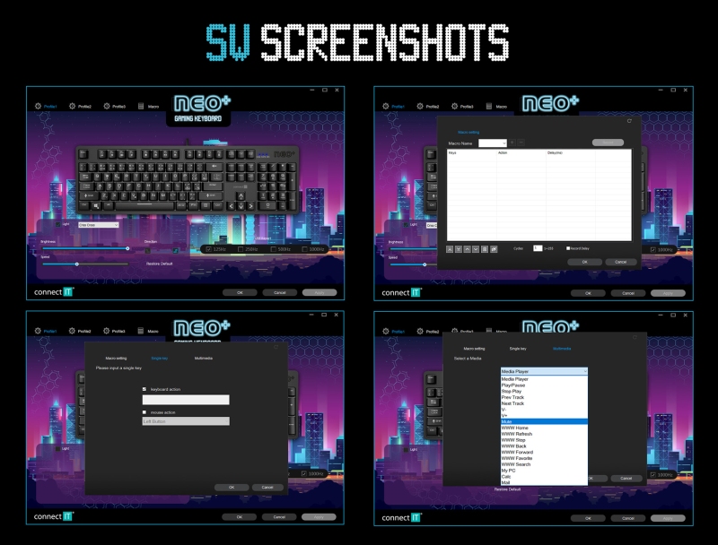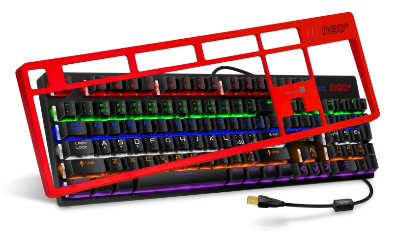 Profesionální mechanická klávesnice s CZ/SK layoutem, 22 režimy RGB podsvícení, softwarem, multimediálními klávesami a výměnným červeným rámečkem. Nechybí podpora maker a samolepky CONNECT IT zdarma.