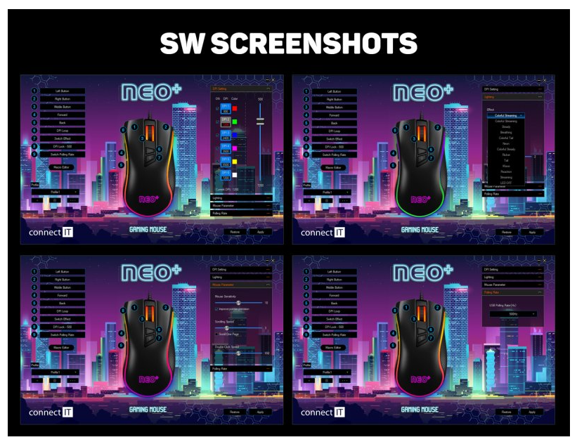 Součástí balení je promo arch samolepek CONNECT IT NEO a možnost stažení softwaru, který umožní nastavení maker, podsvícení, odezvy i profilu DPI. Jednoduše si nastavíte vše, co potřebujete – od barev až po rychlost dvojkliku.