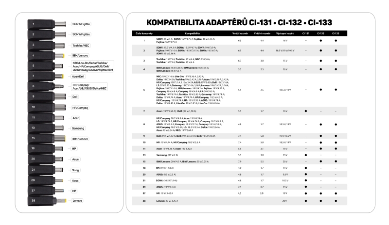 Kompaktní 48W univerzální adaptér s 8 koncovkami a LED kontrolkou. Nabízí ochranu proti zkratu a nadproudu, vhodný pro většinu běžných notebooků – ideální pro domácí i cestovní použití.