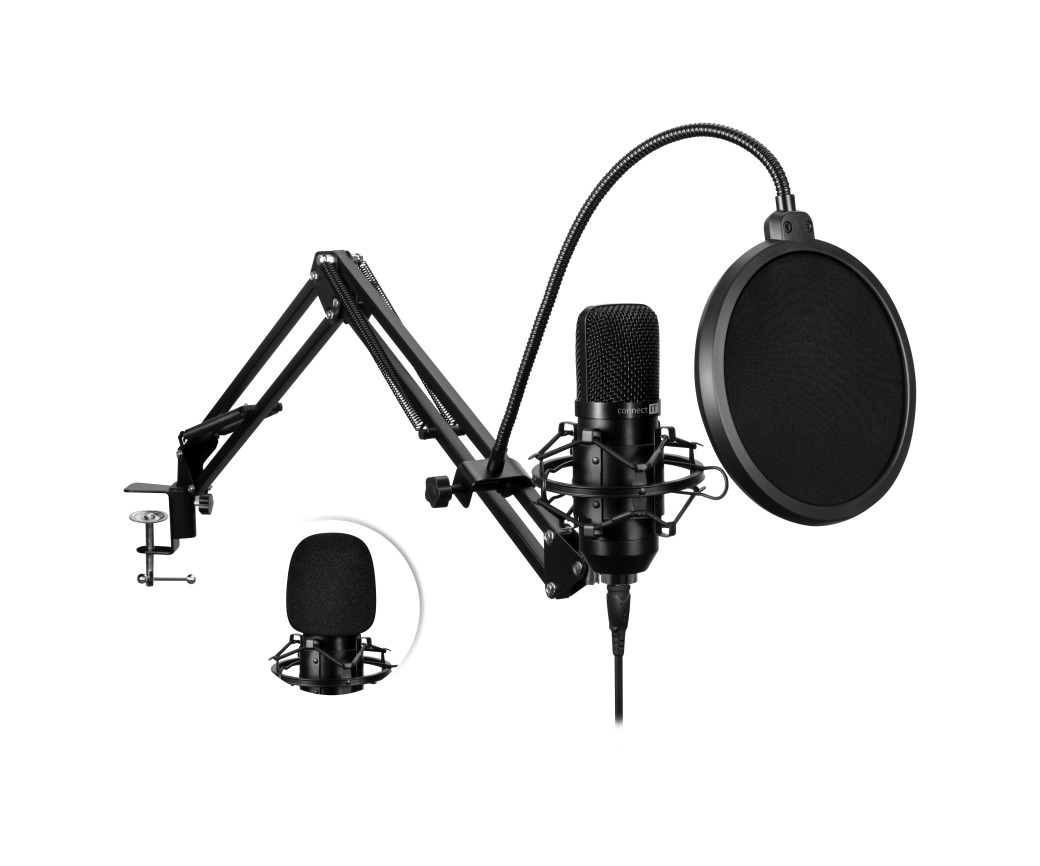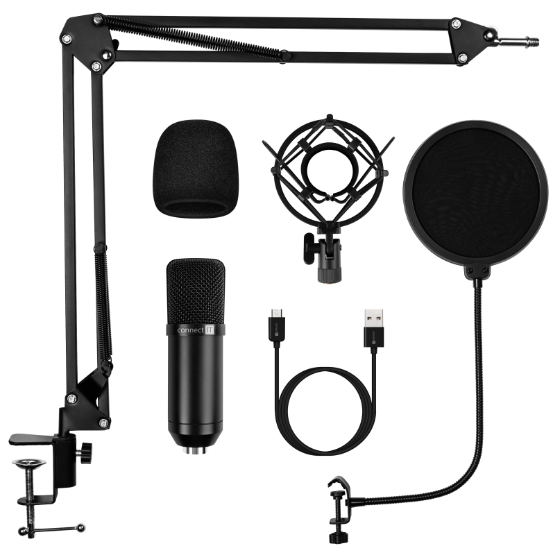 USB mikrofon Connect IT ProMic (CMI-9010-BK) se stolním ramenem je ideální volbou pro streamování, hraní her, podcasty i online komunikaci. Kardioidní směrová charakteristika potlačuje okolní hluk a zaměřuje se na čistý hlasový projev. Součástí je teleskopické kovové rameno s paralelogramovým mechanismem, bezrezonanční uchycení mikrofonu a kruhový POP filtr, který eliminuje praskavé hlásky a zlepšuje kvalitu záznamu. Připojení probíhá jednoduše přes USB bez nutnosti externího napájení.
