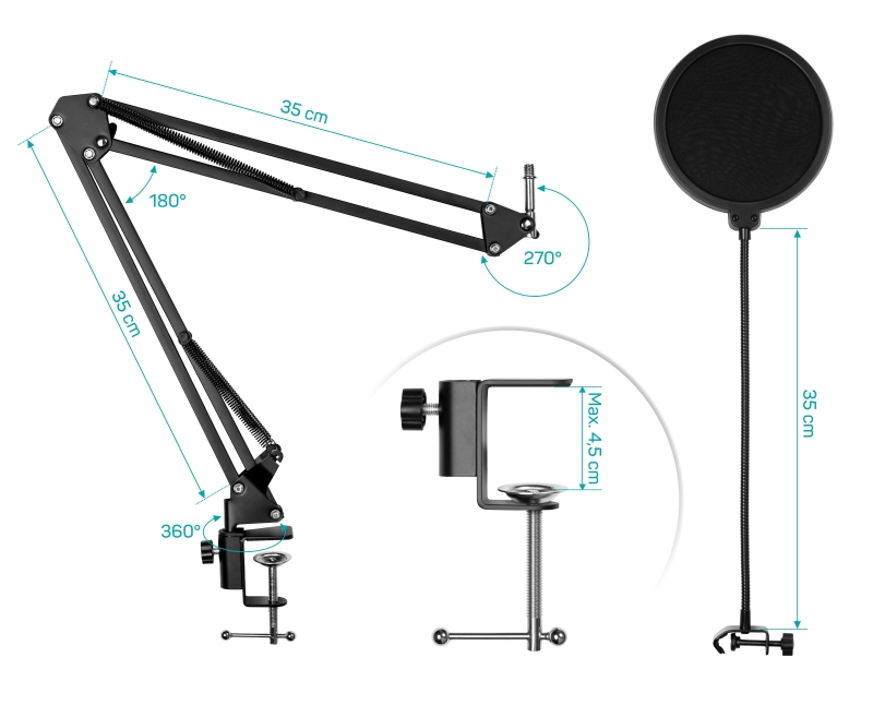 Mikrofon je uchycen na teleskopickém kovovém rameni s paralelogramovým mechanismem a dvojicí pružin, které umožňují plynulé nastavení výšky i úhlu. Rameno lze pevně zafixovat pomocí motýlkových šroubů a je určeno pro montáž na desku stolu o tloušťce až 4,5 cm. Bezrezonanční uchycení minimalizuje přenos vibrací ze stolu.