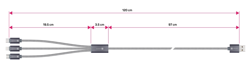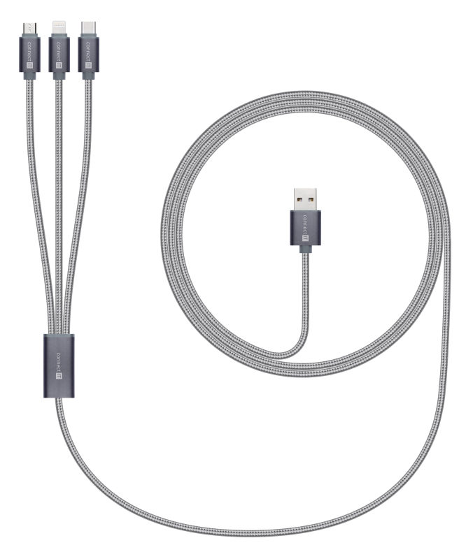Univerzální 3v1 kabel s konektory USB-C, Lightning a Micro USB v délce 1,2 m. Umožňuje nabíjení tří zařízení současně s proudem až 2 A. Má nylonový oplet s metalickým efektem a hliníkové koncovky pro vyšší odolnost.