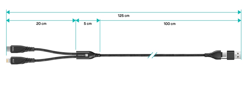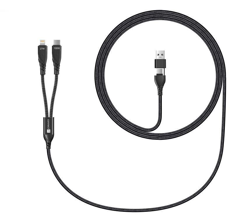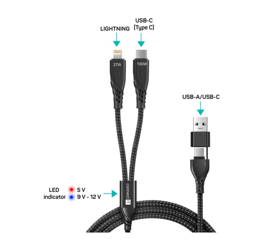 Odolný 4v1 kabel s konektory USB-C a Lightning, délkou 1,25 m a podporou rychlého nabíjení až 5 A. Nabíjí dvě zařízení zároveň, má LED indikaci a nylonový oplet. Vhodný pro zařízení Apple, Android i starší adaptéry díky redukci na USB-A.
