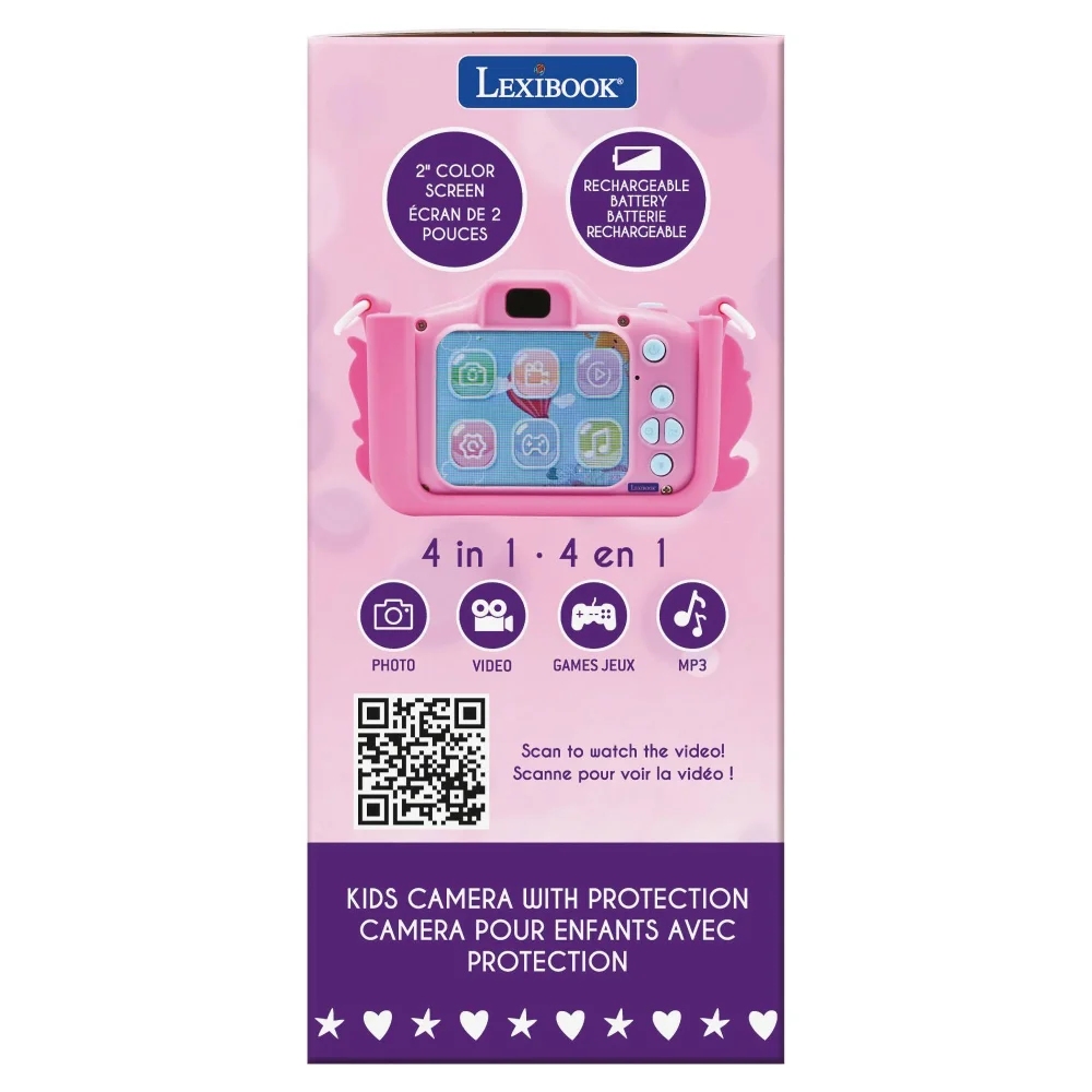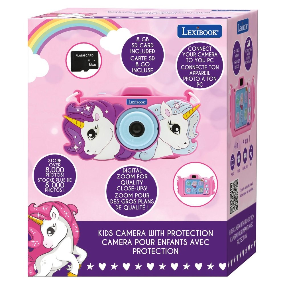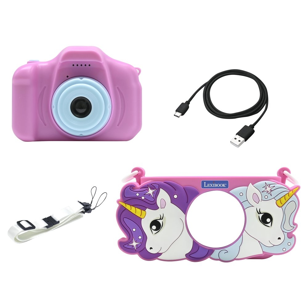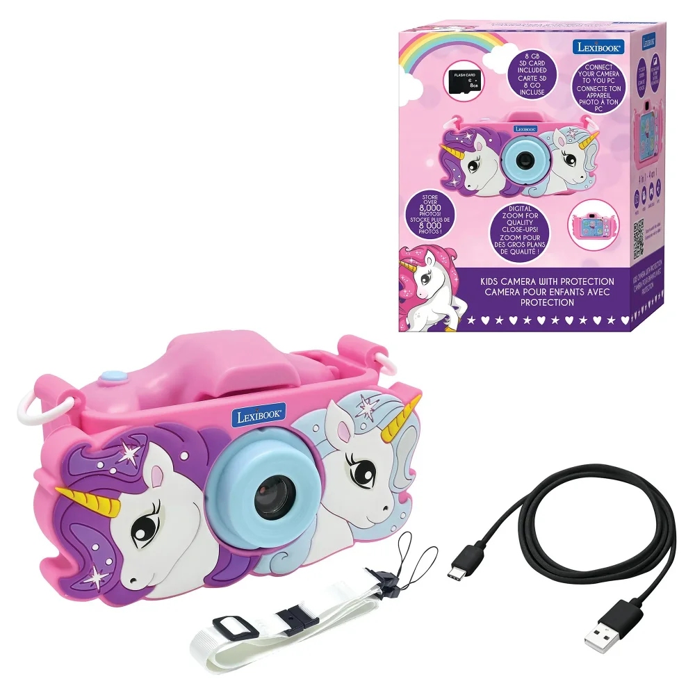 S tímto dětským digitálním fotoaparátem mohou vaše děti zachytit jak fotografie, tak i videa! Díky 2palcovému LCD displeji a 15 různým rámečkům mají možnost upravit své snímky podle vlastního vkusu a užít si zábavu několika způsoby. Zařízení nabízí možnost přehrávání audio souborů díky MP3 režimu. Děti mají přístup k 5 hrám přímo ve fotoaparátu pro zábavu kdekoli. Video lze nahrávat v rozlišení 1080 nebo 960 pixelů ve formátu AVI a fotografie ve formátu JPG.Vestavěnou dobíjecí baterii snadno nabijete pomocí přiloženého kabelu. Součástí balení je 8 GB paměťová SD karta pro uložení až 8 000 fotografií.Dětský fotoaparát umožňuje dětem zachytit svět z vlastní perspektivy a rozvíjet fotografické dovednosti. Přináší nejen zábavu, ale i prostor pro učení, experimentování a vytváření vzpomínek.Klíčové vlastnosti 2 v 1 dětský fotoaparát se silikonovým krytem Jednorožec – fotografie i videa Skvělý kreativní nástroj pro vytváření vzpomínek 2palcový LCD displej 8 GB SD karta je součástí balení (až 8 000 fotek) 15 hravých rámečků 5 zabudovaných herFunkce zoomMožnost přehrávat audio soubory ve formátu MP3 Rozlišení videa 1080 pixelů nebo 960 pixelů ve formátu AVI, fotografie ve formátu JPG Vestavěná dobíjecí baterie Nabíjecí USB kabel typu C je součástí baleníMožnost připojení k PCMateriál: plast Rozměry: 9,8 x 6,5 x 4,6 cm