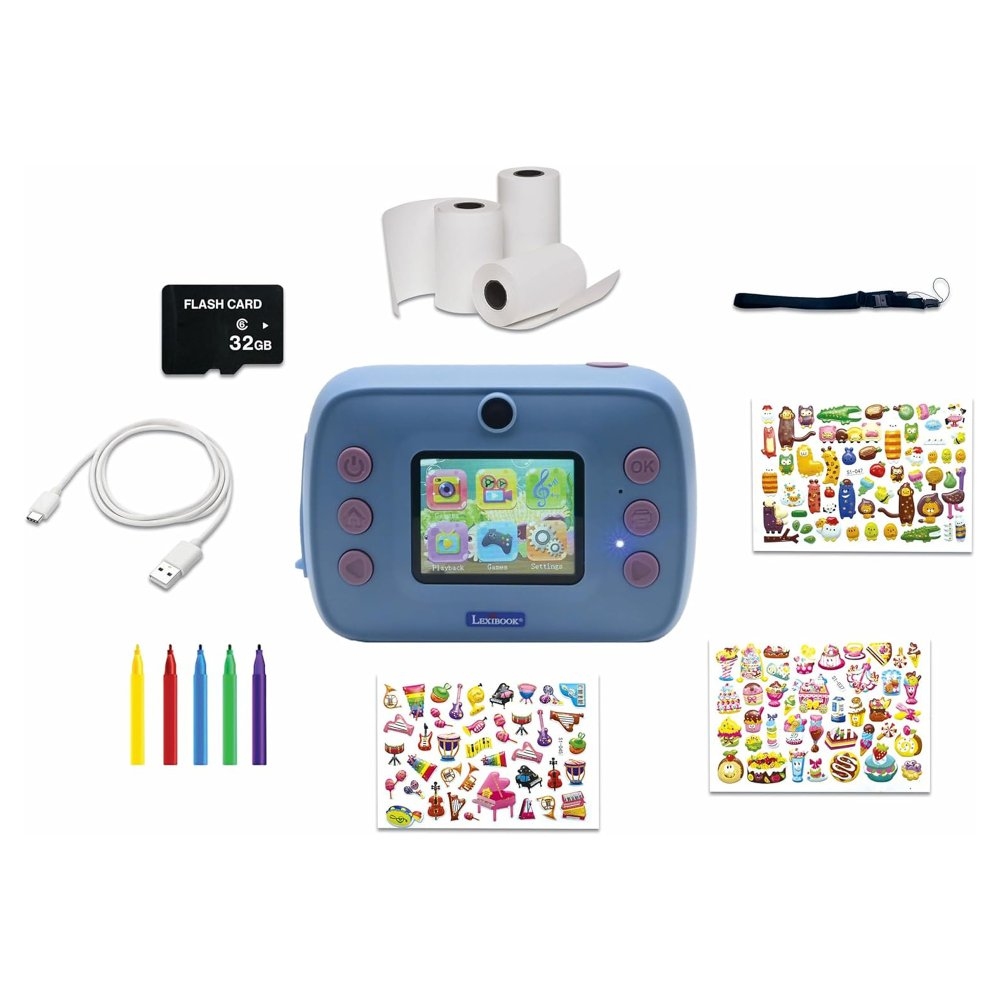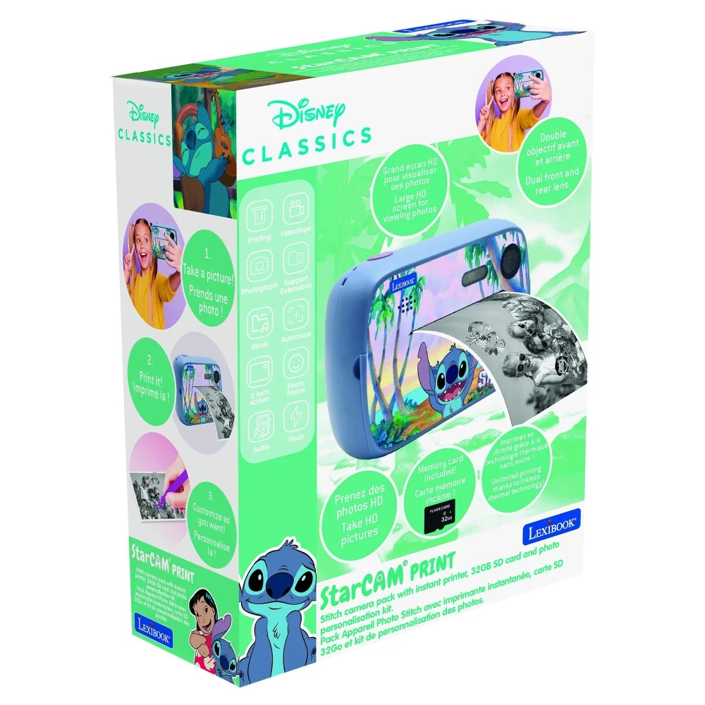 S tímto fantastickým instantním fotoaparátem děti zachytí všechny nezapomenutelné momenty, a navíc úsporně! Kvalitní HD fotografie mohou okamžitě vytisknout v černobílých barvách na termopapír (podobný běžným účtenkám) o rozměrech 2" x 4" (přibližně 5 x 10 cm). Tři přiložené rolky papíru umožňují tisk až 250 fotografií. Fotoaparát nabízí skvělé funkce, jako je nastavení velikosti fotografie, kvality tisku a přednastavené fotorámečky, které dodají vytvořeným vzpomínkám originalitu. V balení dále najdete 3 archy s celkově 170 3 D samolepkami a 5 fix, které dětem umožní kreativně vyzdobit své vytištěné fotografie v albu.Kromě fotografií lze navíc zachytit i videa v HD kvalitě a nastavit jejich rozlišení nebo rychlost. S 32 GB SD kartou může instantní fotoaparát uložit až 30 000 fotografií. Navíc je vybaven velkou HD obrazovkou pro prohlížení fotografií a duálním předním a zadním objektivem, takže si děti mohou pořídit i selfie. Fotoaparát disponuje bleskem pro focení ve tmě a časovačem. Veškerý nasbíraný materiál lze nahrát do PC (za pomocí USB-C kabelu nebo vložením SD karty).Díky dobíjecí baterii, kterou můžete snadno dobít pomocí přiloženého kabelu, fotoaparát poskytuje až 4-5 hodin neomezeného používání. V balení je zahrnuto poutko na ruku, což usnadňuje pohodlné a bezpečné nošení.Dětský fotoaparát je skvělý nástroj pro podporu kreativity a sebevyjádření dětí. Umožňuje jim zachytit svět z vlastní perspektivy a rozvíjet fotografické dovednosti. Přináší nejen zábavu, ale i prostor pro učení, experimentování a vytváření vzpomínek.Klíčové vlastnostiDětský instantní fotoaparát StarCAM® Disney Stitch s HD kvalitou rozlišeníOkamžitý tisk černobílých fotek na bílý termopapír o rozměrech 2" x 4" (přibližně 5 x 10 cm)Fantastické funkce: fotografie, videa, hudba i hry32 GB paměťová SD karta součástí balení (uložení až 30 000 fotek)Umožňuje zachytit fotografie i selfieLevné focení pro děti: 3 ruličky termopapíru součástí balení (až 250 fotografií), papír podobný běžným účtenkámŠiroké možnosti nastavení: velikost fotografie, kvalita tisku, časovač, rozlišení videa, jeho rychlost a dalšíPřednastavené rámečky pro přizpůsobení fotografiíVytvářejte s dětmi originální alba za pomocí kreativních pomůcek3 archy se 170 barevnými 3 D samolepkami5 barevných fix – žlutá, červená, modrá, zelená a fialováBlesk pro focení ve tměŘemínek na zápěstí pro pohodlnější a bezpečné nošeníDuální přední a zadní čočka (1,3 MP snímače a rozlišení obrázků až 12 MP)Velká HD obrazovka pro prohlížení fotografií (2" / cca 5 cm)Materiál lze nahrát do PC – pomocí USB-C kabelu nebo vložením SD kartyVestavěná dobíjecí baterie poskytuje až 4-5 hodin používání (nabíjení pomocí přiloženého USB-C kabelu)Přibližná velikost: 11,2 x 8 x 5 cmNáhradní rolky papíru k zakoupení: samolepící barevný a bílý termopapír od Lexibooku