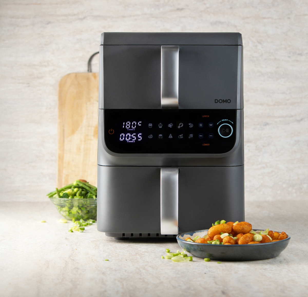 Díky chytrému vertikálnímu designu se dvěma zásuvkami nad sebou ušetříte s vertikální dvojitou fritézou DOMO DO549FR až 30 % místa v kuchyni.
