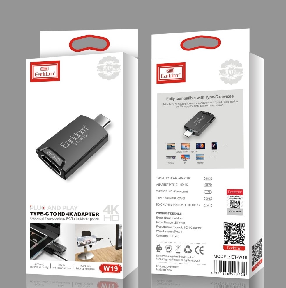 Jednoduché propojení USB-C zařízení s HDMI obrazovkou. Tento kompaktní adaptér Earldom umožňuje přenést obraz a zvuk z notebooku, tabletu nebo kompatibilního telefonu s USB-C na monitor, televizi nebo projektor s HDMI vstupem.