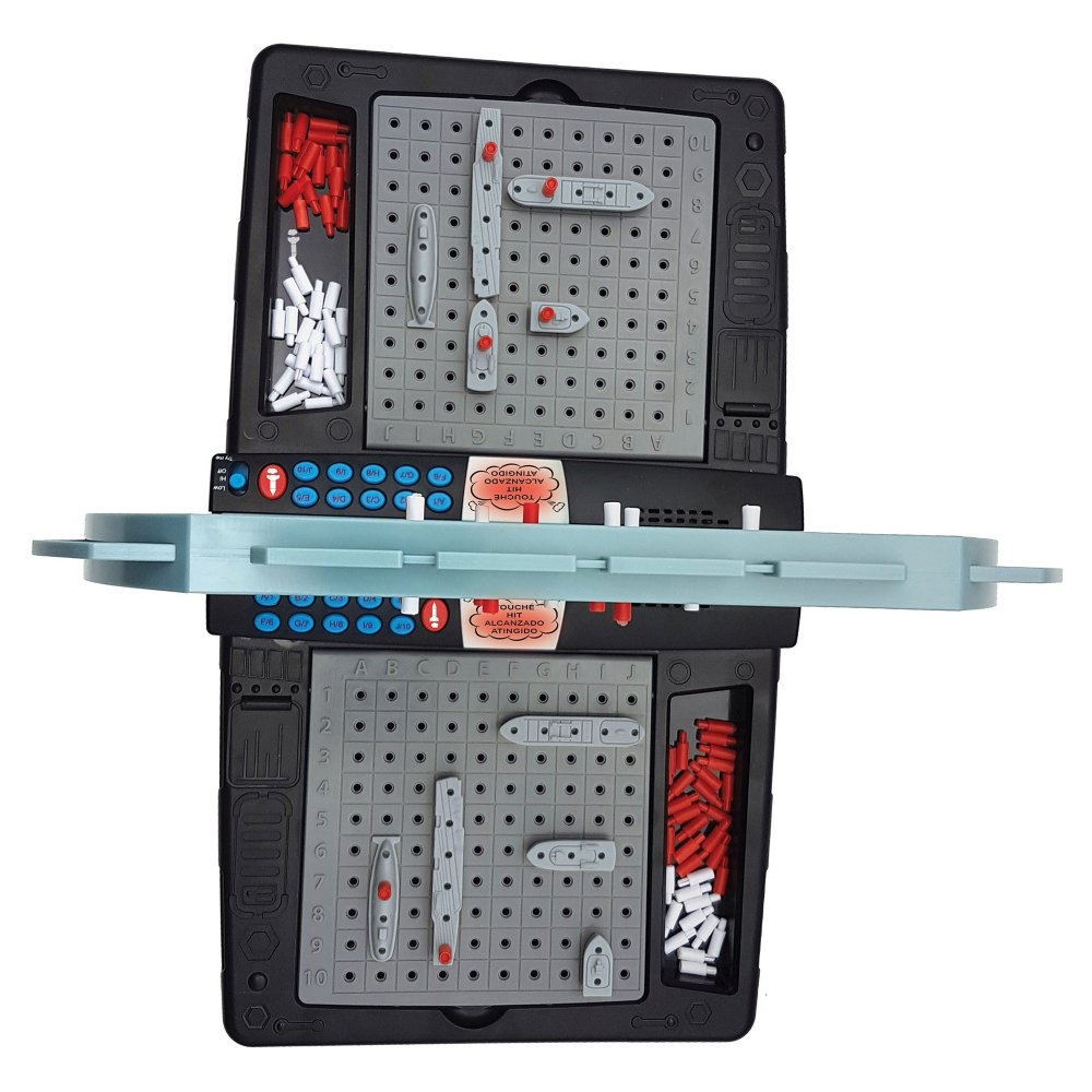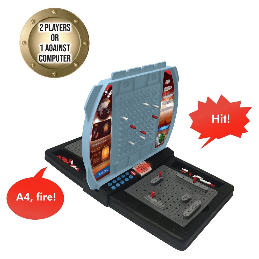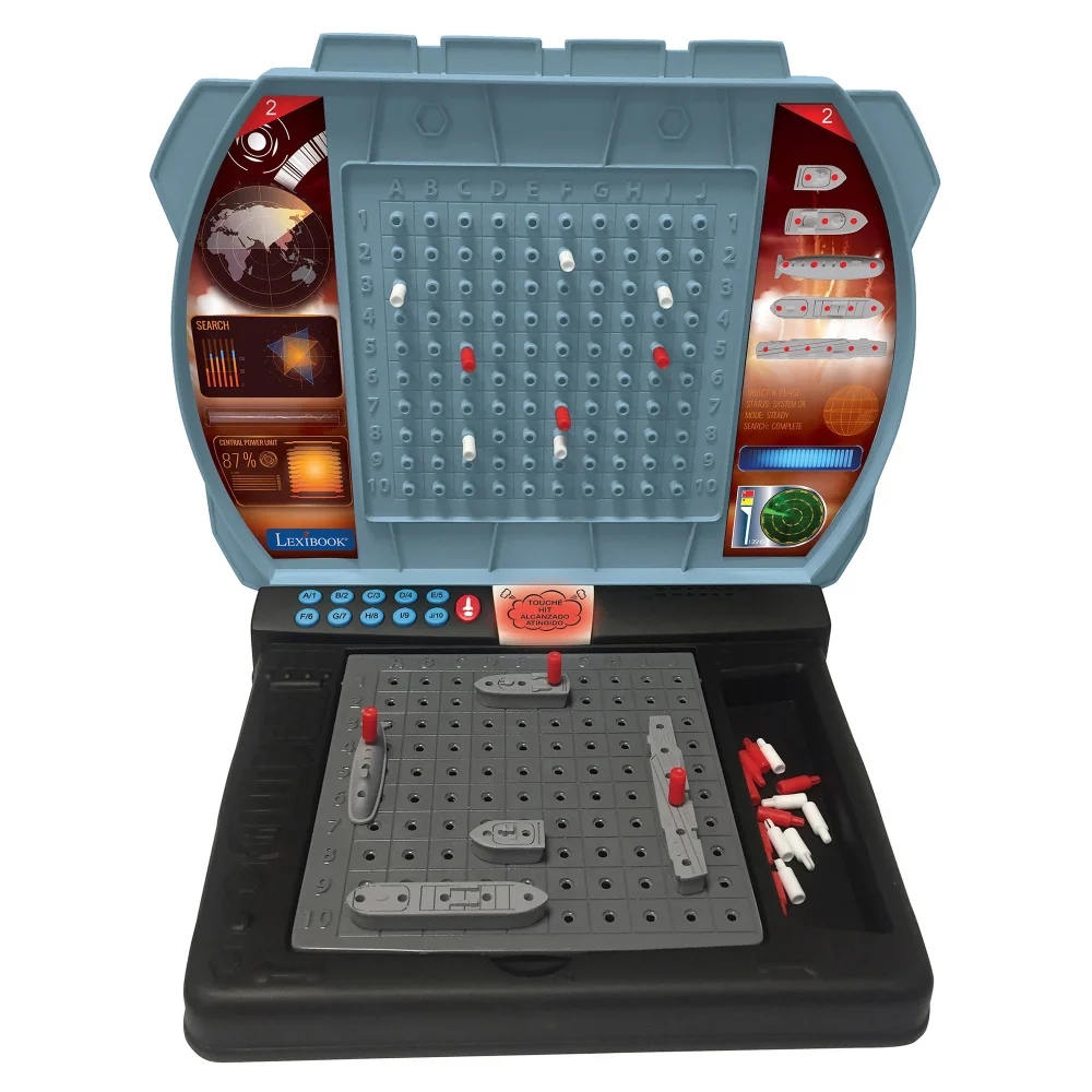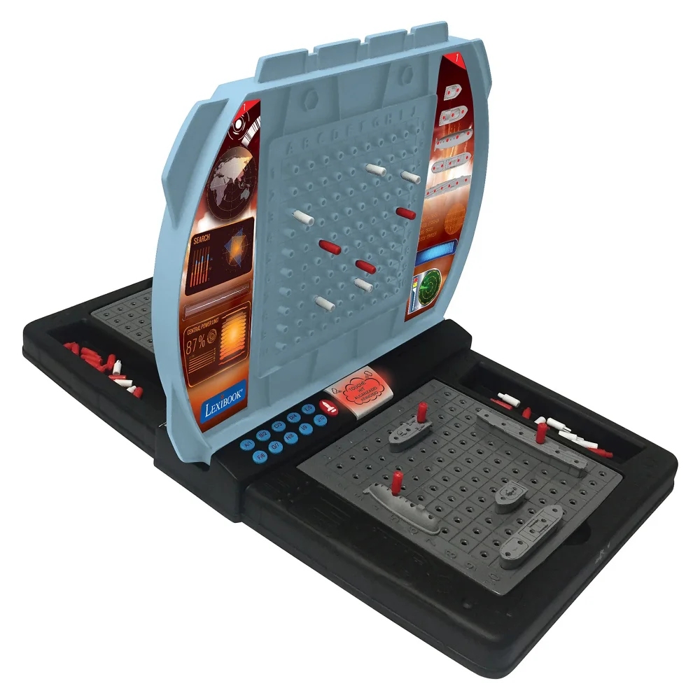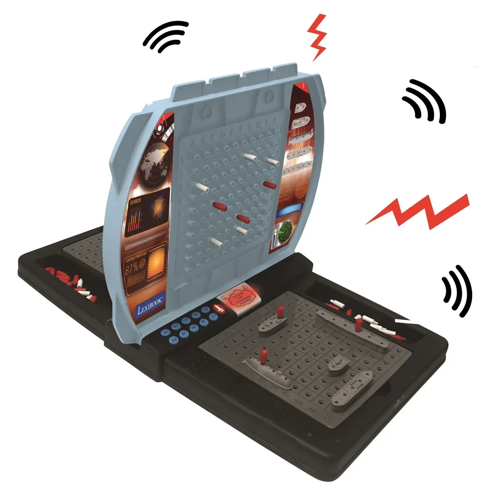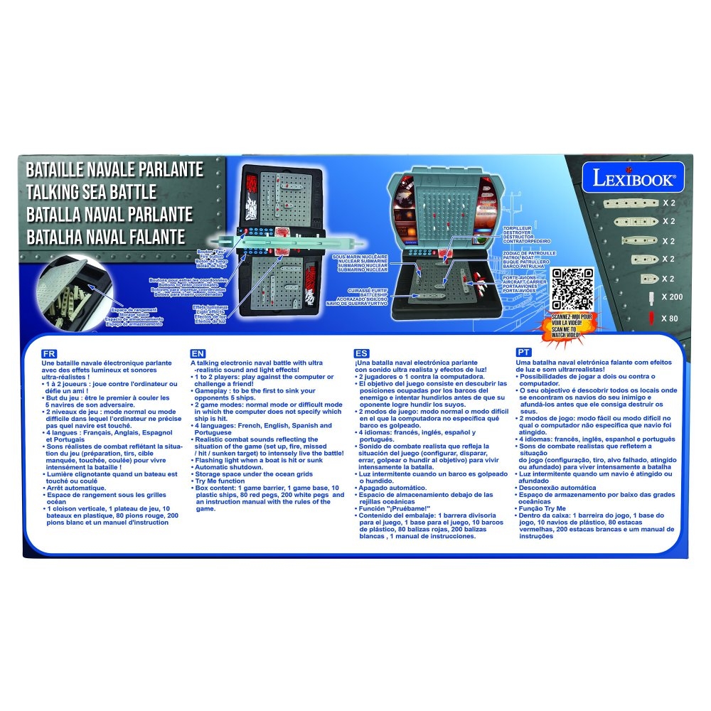 Hrávali jste jako malí strategickou hru lodě? Představte ji vašim dětem v moderní podobě! Mluvící elektronická hra s námořními bitvami pro dva hráče zabaví děti na dlouhé chvíle. Bojovat můžete proti sobě nebo proti počítačovému soupeři. Začít je snadné – jednoduše rozestavte svých pět lodí na mřížce oceánu, zadejte souřadnice ke každé lodi a pak už jen střílejte. Zvolte písmeno a číslo cílové souřadnice a stisknete tlačítko "PAL". Snažte se strategicky potopit soupeřovu flotilu dříve, než on zničí tu vaši. Červenými a bílými kolíčky si značte úspěšné a neúspěšné zásahy (na horní mřížce značte vaše zásahy, na dolní soupeřovy). Vyberte si ze dvou herních režimů – snadný režim nebo obtížný režim, ve kterém počítač neurčuje typ zasažené lodi. Součástí hry jsou realistické bojové zvuky a blikající světla po potopení nebo zasažení plavidla. Tak vzhůru do boje!Hra funguje na tři 1,5 V baterie typu AA/LR6 (jsou součástí balení). Hru můžete nastavit ve čtyřech jazycích (FR/EN/ES/PT) a pod mřížkami oceánu se navíc nachází i úložný prostor pro všechny herní figurky. Hra se po 5 minutách nečinnosti automaticky vypne (po vypnutí se herní nastavení neuloží).Strategické hry jsou dobrým nástrojem ke stimulaci intelektuálního rozvoje dětí. Jsou ideální k procvičování deduktivních schopností logického uvažování a učení se dosáhnout cílů prostřednictvím propracovaných plánů. Tyto typy her navíc děti učí, jak řešit problémy, což jim v dospělosti přijde vhod.Klíčové vlastnostiElektronická mluvící hra s námořními bitvamiSkvělá zábava pro děti1 až 2 hráči: hrajte proti počítači nebo vyzvěte kamarádaCílem hry je jako první potopit protivníkovi 5 lodíStimulace intelektuálního rozvojeProcvičování logického uvažování2 herní režimy: snadný nebo obtížný (počítač neurčuje typ zasažené lodi)4 jazyky (francouzština, angličtina, španělština, portugalština)Realistické bojové zvuky (střelba, zásah, potopený cíl) a blikající světloAutomatické vypnutí po 5 minutách nečinnosti (herní nastavení se neuloží)10 plastových lodí, 80 červených kolíčků a 200 bílých kolíčků, 2 oceánské mřížky, 2 cílové mřížkyÚložný prostor pod oceánskými mřížkamiNapájení: 3x 1,5 V baterie typu AA/LR6 (jsou součástí balení)