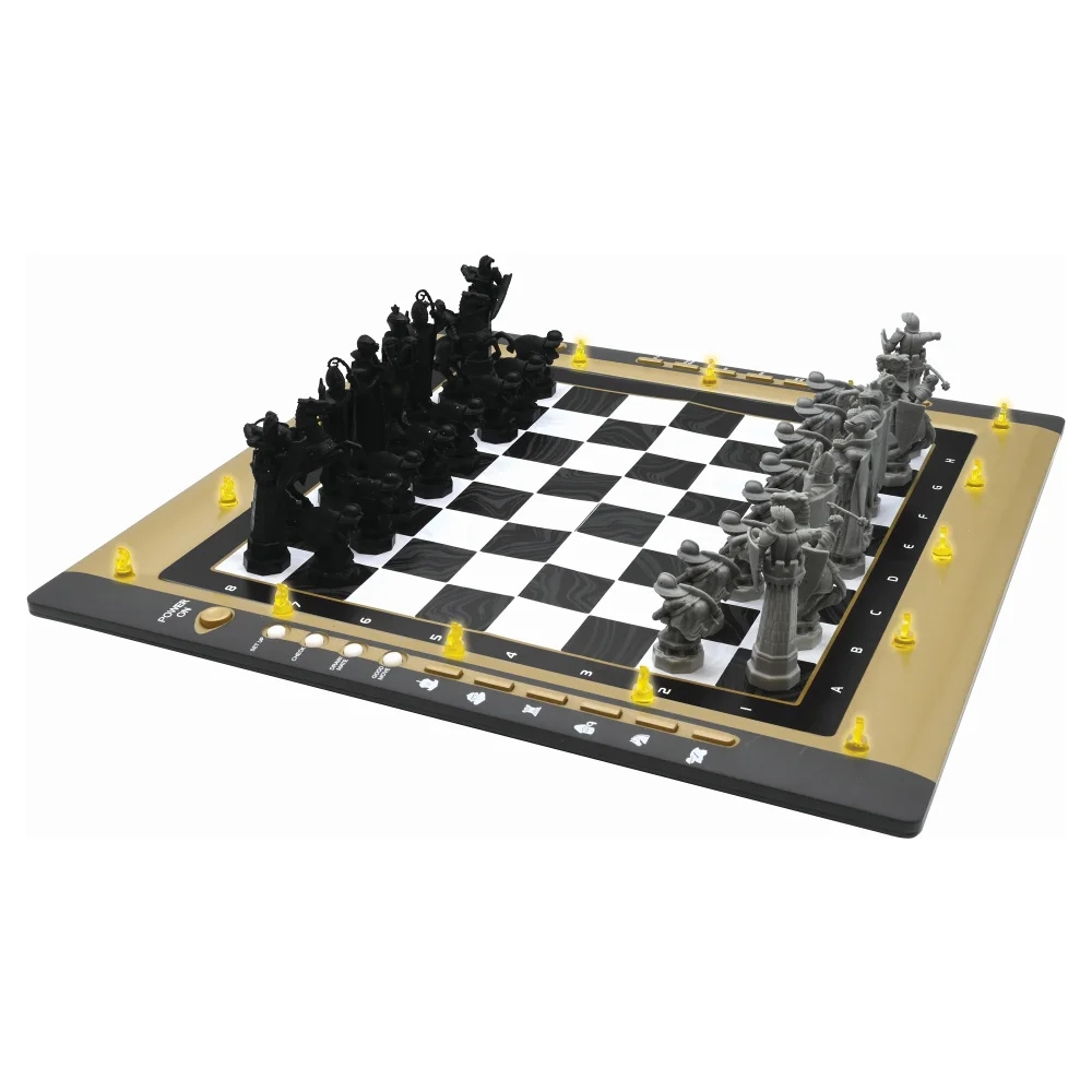 Elektronická šachová sada Harry Potter je ideální elektronickou šachovou sadou pro výuku šachů nebo zlepšení vašich šachových dovedností. Je vybavena 64 úrovněmi obtížnosti, přizpůsobí se vaší úrovni a bude vás doprovázet při vašem postupu.   Pro zkušenější hráče nabízí elektronická šachová hra Harry Potter navíc "zlepšovací režim", který hráči ukáže, zda je tah, který právě provedl, optimální, a umožní mu jej následně zopakovat.   Můžete hrát proti počítači nebo proti jinému hráči. Vhodné pro děti od 7 let i pro dospělé.   Skvělá interaktivní elektronická šachová hra! Nádherný design Harryho Pottera s personalizovanými figurkami z filmu Šachy se hrají na 64 úrovních, včetně 5 úrovní pro začátečníky, ve kterých počítač  povzbuzuje svého soupeře záměrným obětováním šachových figurek.  "výukový" režim, ve kterém počítač hráči naznačuje, zda tahy, které provedl, jsou správné.  Počítač pomáhá hráčům rozdáváním nápověd ("funkce nápovědy").  ELO 1800, vizualizace odehraných tahů pomocí LED (svítící diody). Šachovnice pro zapamatování všech tahů, hra proti počítači nebo s druhým hráčem.  Extra funkce speciálně navržené pro začátečníky: "tréninkový" režim (indikuje, zda je  je tah optimální), "nápověda" (navrhne tah), funkce "vzít zpět" (lze se vrátit až o 2 tahy zpět). Napájení: 3 baterie LR6/AA 1,5 V (nejsou součástí balení) nebo napájecí adaptér 9 V, 300 mA