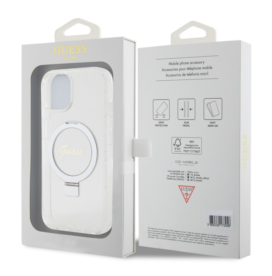 Představujeme vám Guess IML Ring Stand Glitter MagSafe - lehký a funkční kryt navržený přesně pro váš telefon, který zachovává snadný přístup ke všem tlačítkům a konektorům.