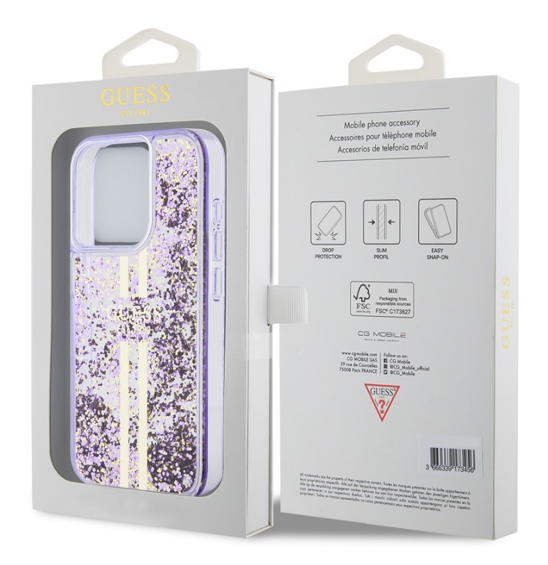 Guess PC/TPU Liquid Glitter Gold Stripe Zadní Kryt pro iPhone 15 Pro Purple
