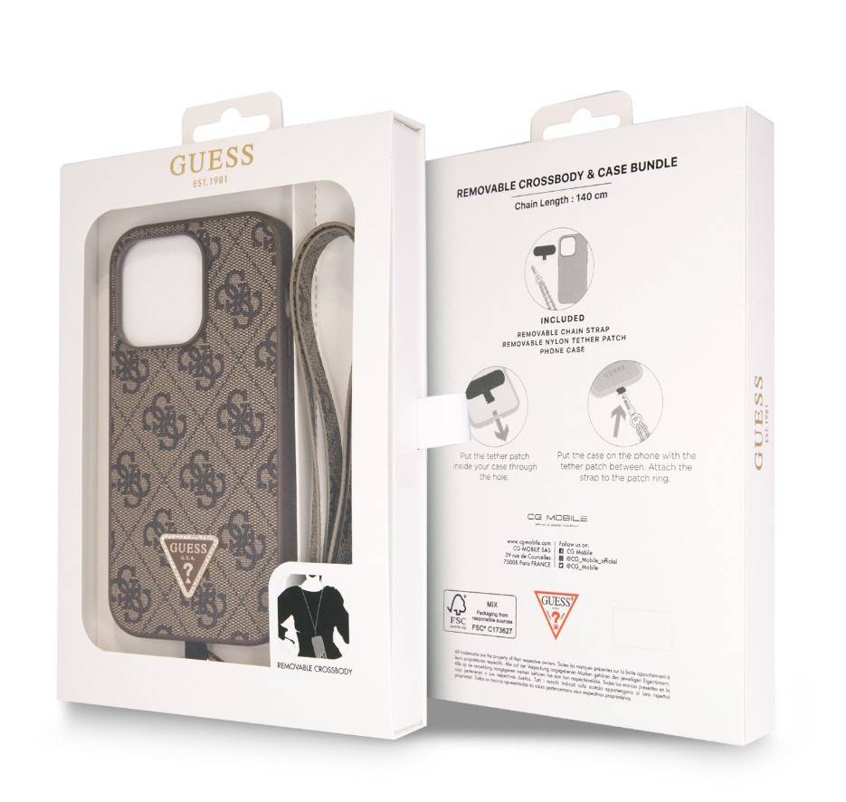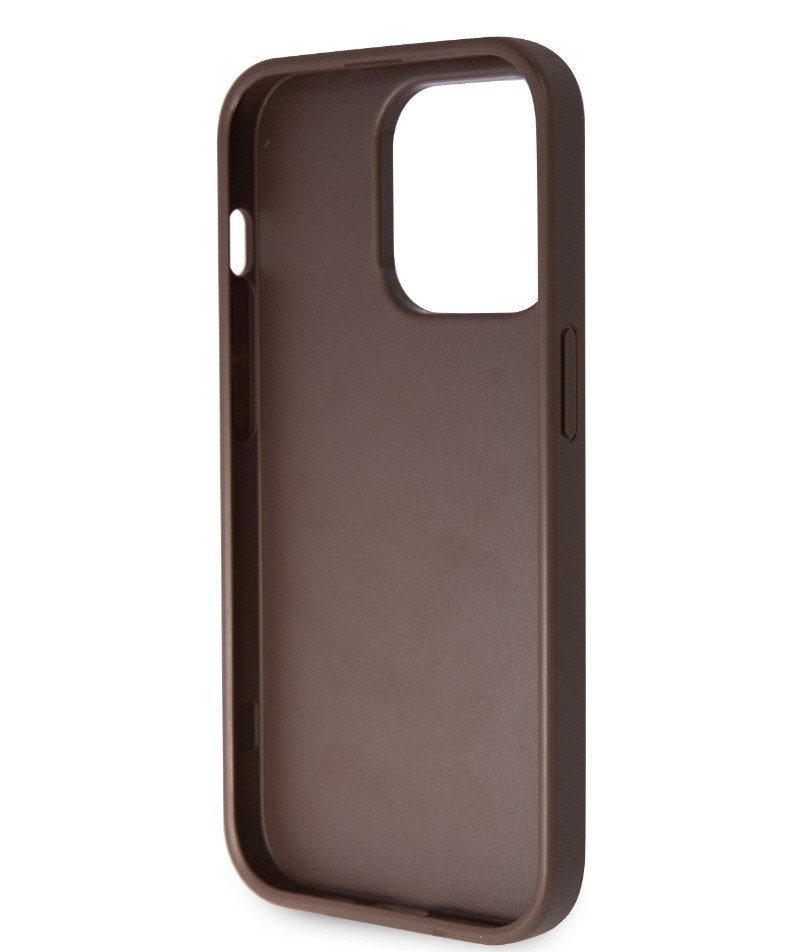 Guess PU 4G Strass Triangle Metal Logo Zadní Kryt + Crossbody Popruh pro iPhone 15 Pro Hnědý