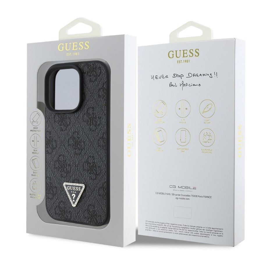 Prémiový zadní kryt Guess PU 4G Strass Triangle Metal Logo se vyznačuje elegantním, charakteristickým 4G vzorem, doplněným o zlaté triangle logo GUESS.
