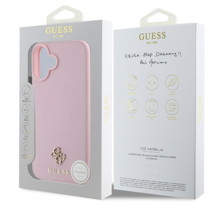 Stylová ochrana s podporou MagSafe Zadní kryt Guess PU Grained 4G Small Metal Logo pro iPhone 16v růžové barvě kombinuje sofistikovaný vzhled, kvalitní ochranu a podporu technologie MagSafe. Povrch s jemnou texturou a elegantním kovovým logem Guess dodává vašemu zařízení jedinečný a prémiový charakter.
