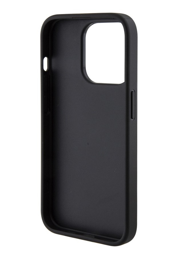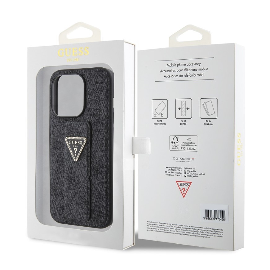 Guess PU Grip Stand 4G Strass Triangle Metal Logo Zadní Kryt pro iPhone 15 Pro Black