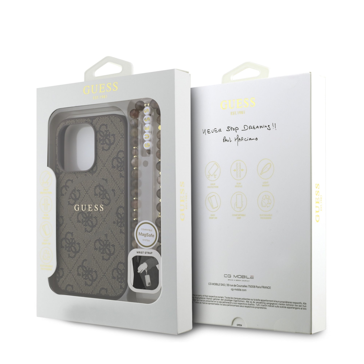 Guess PU Leather 4G Colored Ring Strap MagSafe zadní kryt pro iPhone kombinuje prémiový módní design s praktickou ochranou telefonu. Luxusní 4G vzor, kovové logo Guess a barevný MagSafe kroužek dodávají krytu výrazný elegantní vzhled, který perfektně doplní váš outfit. Odolná PU umělá kůže zajišťuje pevný úchop, chrání telefon před poškrábáním a prachem a zároveň podporuje bezdrátové nabíjení MagSafe. Stylové korálové poutko na zápěstí zvyšuje bezpečnost při používání a dělá z krytu nejen ochranu, ale i módní doplněk pro každý den.