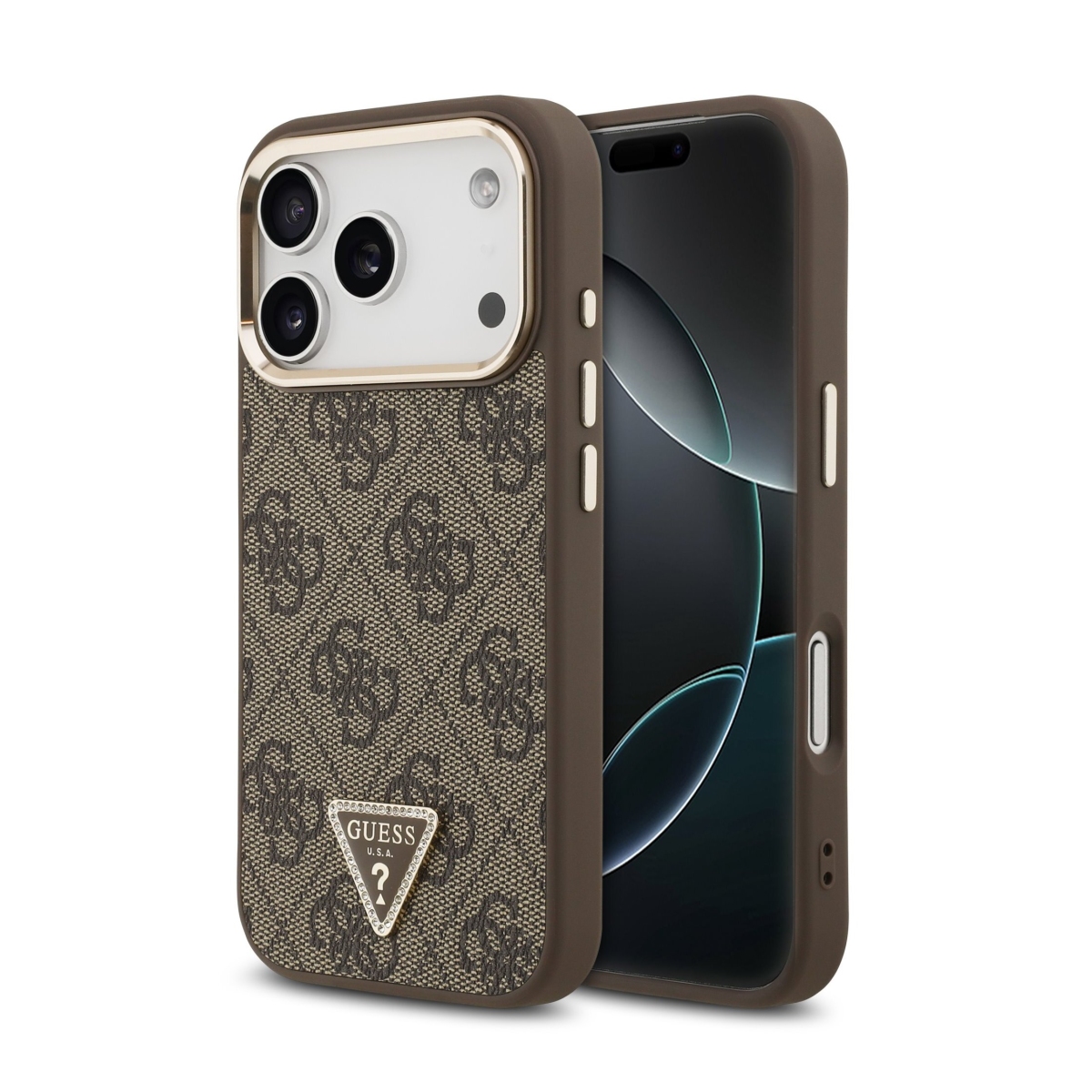 Guess PU Leather 4G Strass Triangle Logo Gold Frame MagSafe Zadní Kryt pro iPhone 17 Pro – hnědá