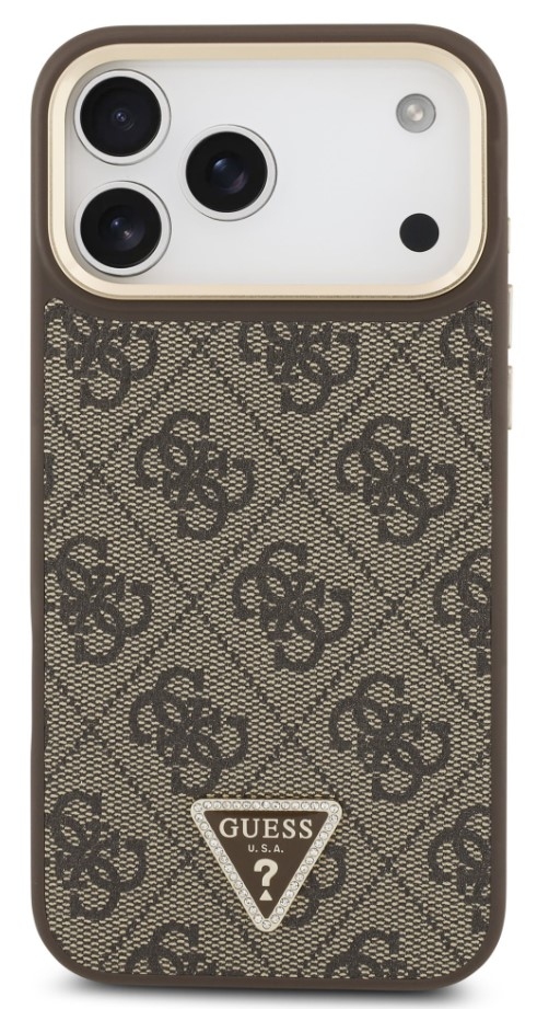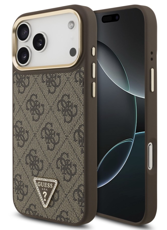 Guess zadní kryt pro iPhone 17 Pro Max, PU Kůže 4G Triangle Logo Gold Frame MagSafe - hnědá