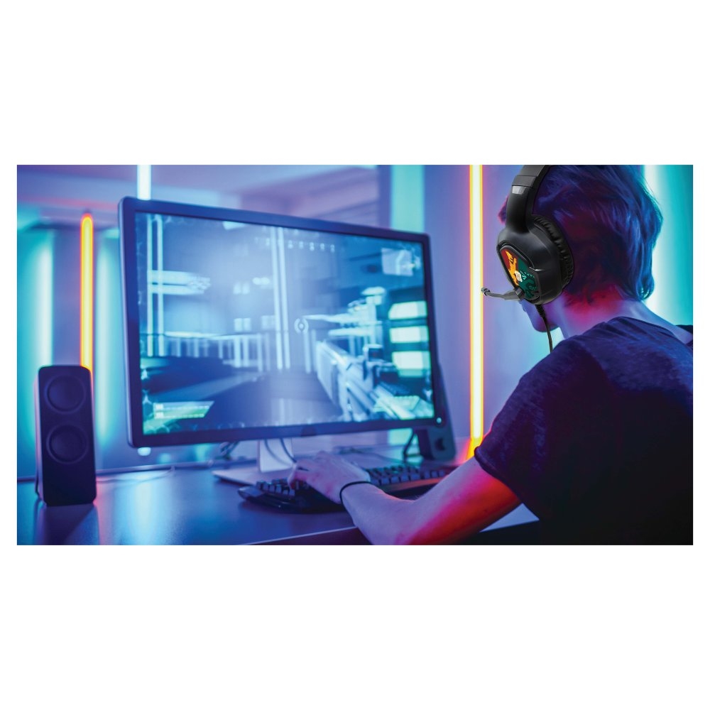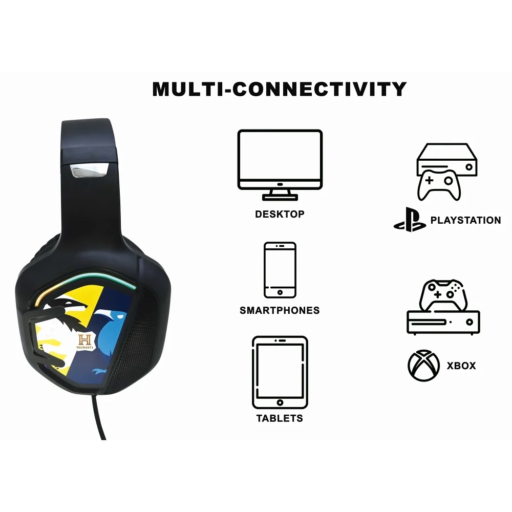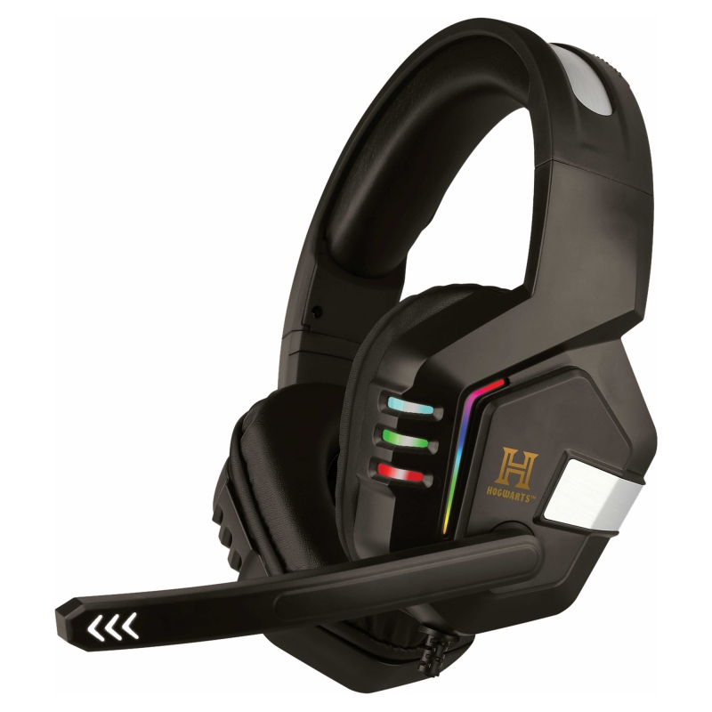 Pohodlná náhlavní souprava Harry Potter pro pohlcující herní zážitek Mimořádně pohodlný a lehký design s koženkovými náušníky Kompatibilita s více platformami (PC, tablet, chytrý telefon, Nintendo, PS a XBOX)  Duální připojení pomocí USB a Aux-in 1x rozbočovač konektoru Aux-in 1x převodník USB-C na Aux-in Kabel o délce 2 m (součástí balení)  Vysoce kvalitní stereofonní zvuk  Flexibilní mikrofon (součástí balení)  Světelné efekty LED po stranách