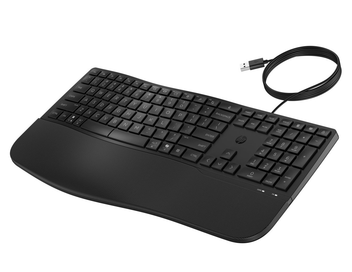 Ergonomická kabelová klávesnice HP 480 Comfort (8T6M1AA#BCM) s třemi polohami náklonu, 23 programovatelnými klávesami a funkcemi pro celodenní pohodlné psaní.