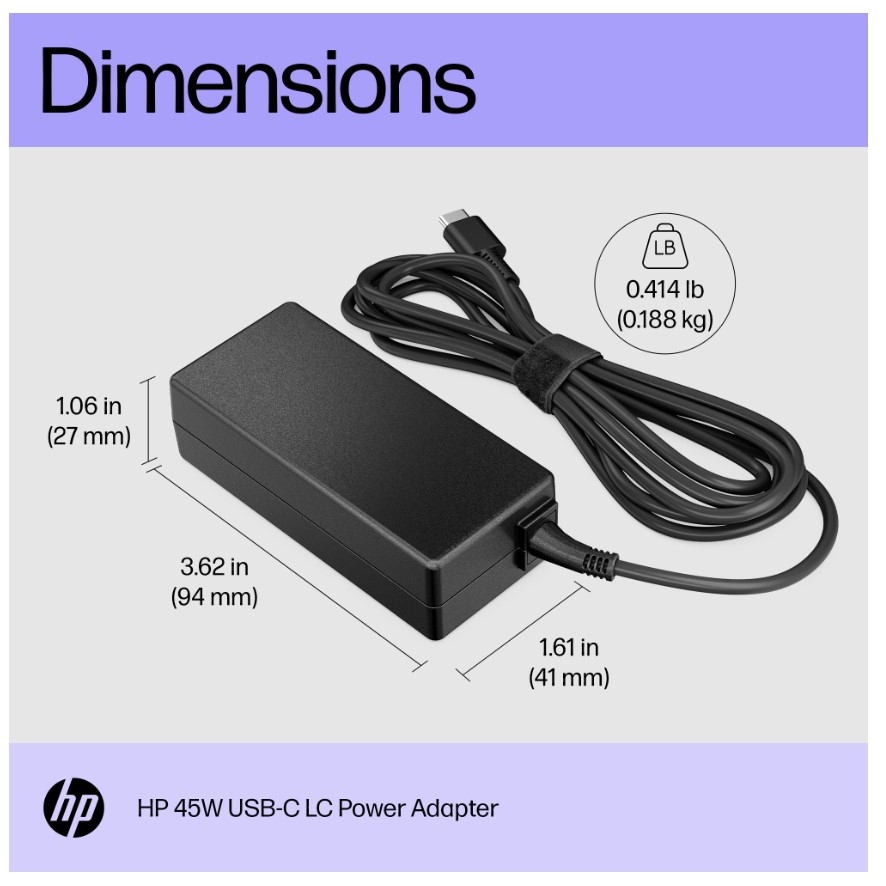 Kompaktní napájecí adaptér pro notebooky s USB-C. Adaptér HP s výkonem 45 W je navržen pro spolehlivé napájení vybraných notebooků vybavených portem USB-C. Poskytuje stabilní přísun energie pro každodenní práci doma, v kanceláři i na cestách.
