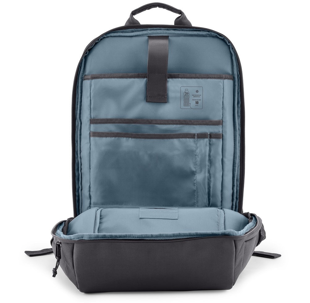 HP Travel batoh nabízí uzamykatelné zipy pro větší bezpečnost a měkké ramenní popruhy pro pohodlné nošení i při delším cestování. Externí tkanina je vyrobena z recyklovaných plastů, čímž podporuje udržitelný přístup k modernímu designu.