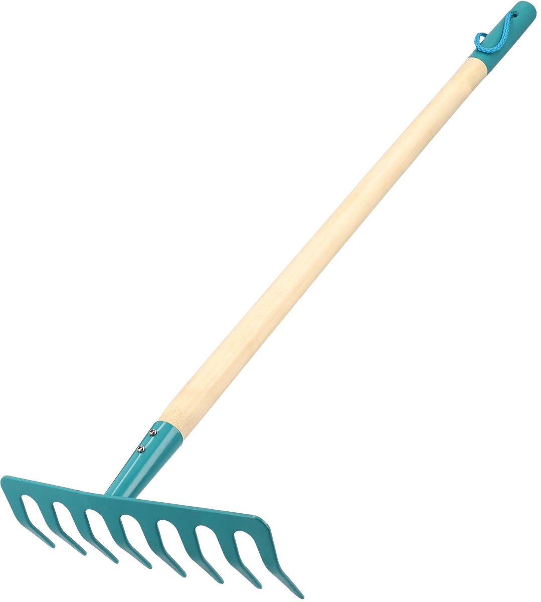 Velmi kvalitní a plně funkční dětské hrabičky v modré barvě s dřevěnou násadou. Ideální pro zapojení malých dětí do zahradnických činností jako je hrábaní listí nebo urovnání půdy.