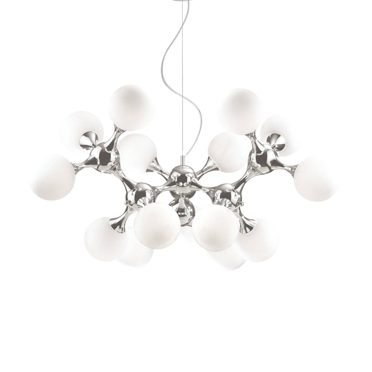 Designový závěsný lustr v moderním stylu vyrobený v Itálii značkou Ideal Lux. Velikos t - D 1050 x H min 830 / max 2400 mm, Velikost těla - D 1050 x H 580 mm, Velikost skleněného stínidla - D 150 x H 140 mm. Světla - E14 max 15 x 28W.